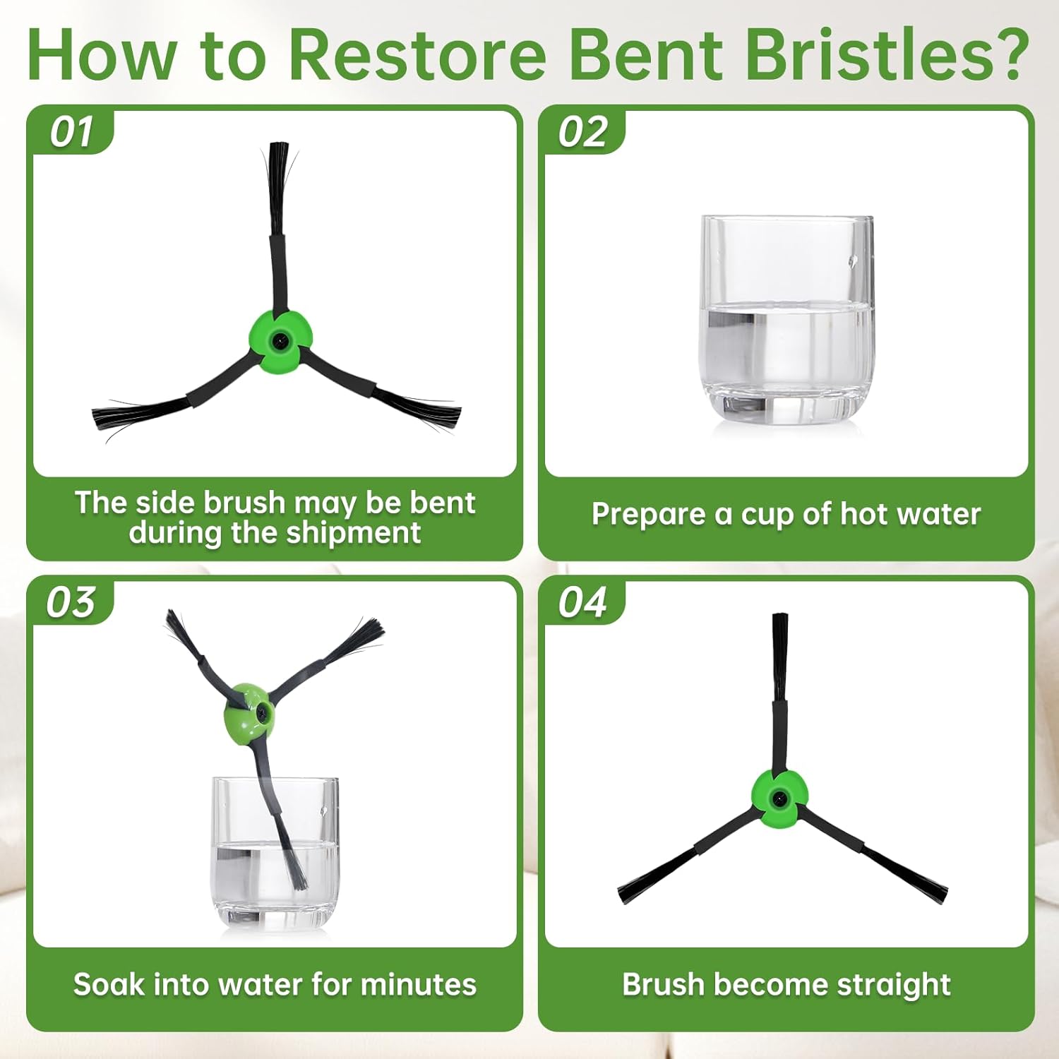 - Wartung: Wenn die Seitenbürsten durch den Transport verbogen oder eingerollt sind, legen Sie sie einfach ein paar Minuten in warmes Wasser, um sie wieder instand zu setzen