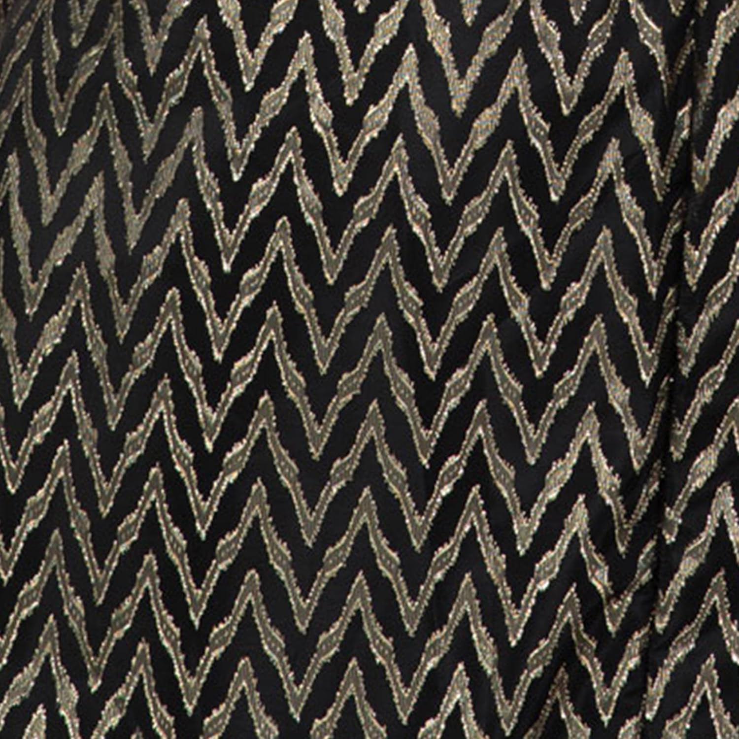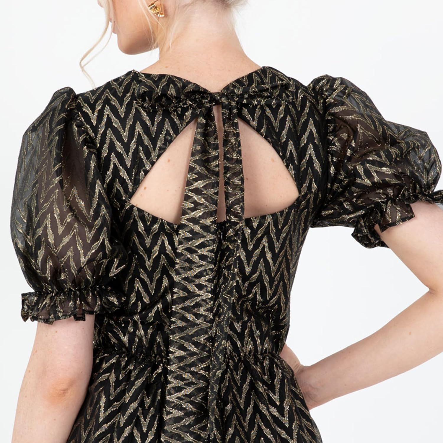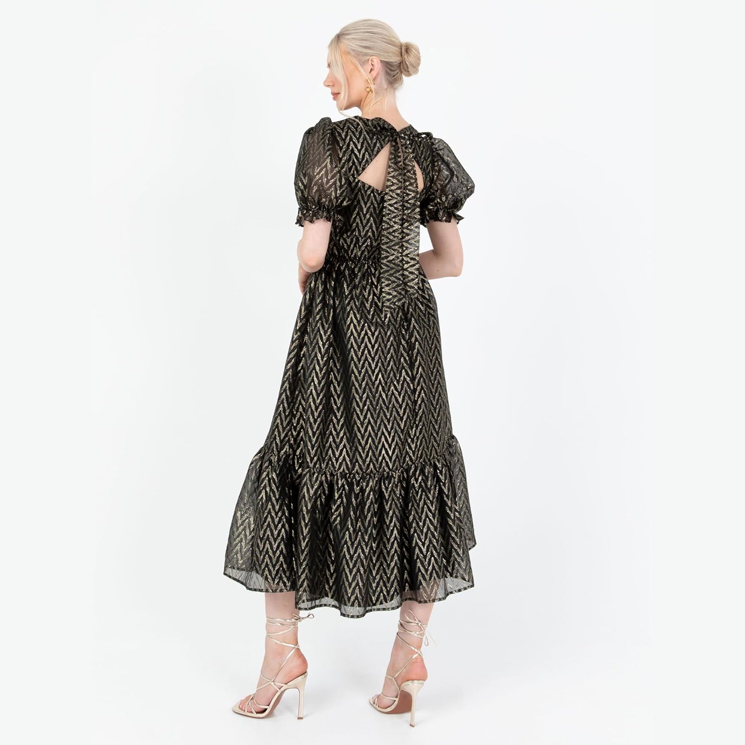 PRODUKTBESCHREIBUNGEN For a playful cocktail dress with all the intricate detailing you need this party season, look no further than this statement dress from Lovedrobe Luxe. Cut into an elegant midaxi length, this evening dress showcases a metallic zigzag pattern throughout. Style notes include a round neckline, short puffed sleeves and a keyhole back. The elegant women's dress is finished with a tie-back fastening. The look is rounded out by a high waist, A-line silhouette to flatter your shape. Wear this midaxi evening dress with matching platform heels for a sophisticated evening look. Style notes include: -tieback fastening -metallic chevron pattern -keyhole back - round neckline -midaxi length -balloon sleeves. Comes in one colour- Gold - and 10 EUR sizes: 8UK (36 EU), 10UK (38 EU), 12UK (40 EU), 14UK (42 EU), 16UK (44 EU), 18UK (46 EU), 20UK (48 EU), 22UK (50 EU), 24UK (52 EU), 26UK (54 EU). Treat yourself to this classic elegant evening dress.