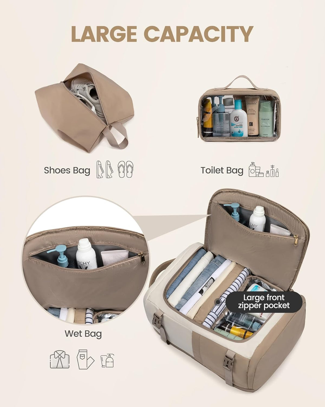 - GROSSE KAPAZITÄT: 17-Zoll-Abmessungen: 47x33x20,5 cm / 18,5x13x8,1 Zoll, Kapazität: 40L ≈ 20" Koffer. 18-Zoll-Abmessungen: 49x34,5x21 cm / 19,3x13,6x8,3 Zoll, Kapazität: 50L ≈ 24" Koffer. Schuhbeutel: 41x23 cm / 16,1x9,1 Zoll, Kulturbeutel: