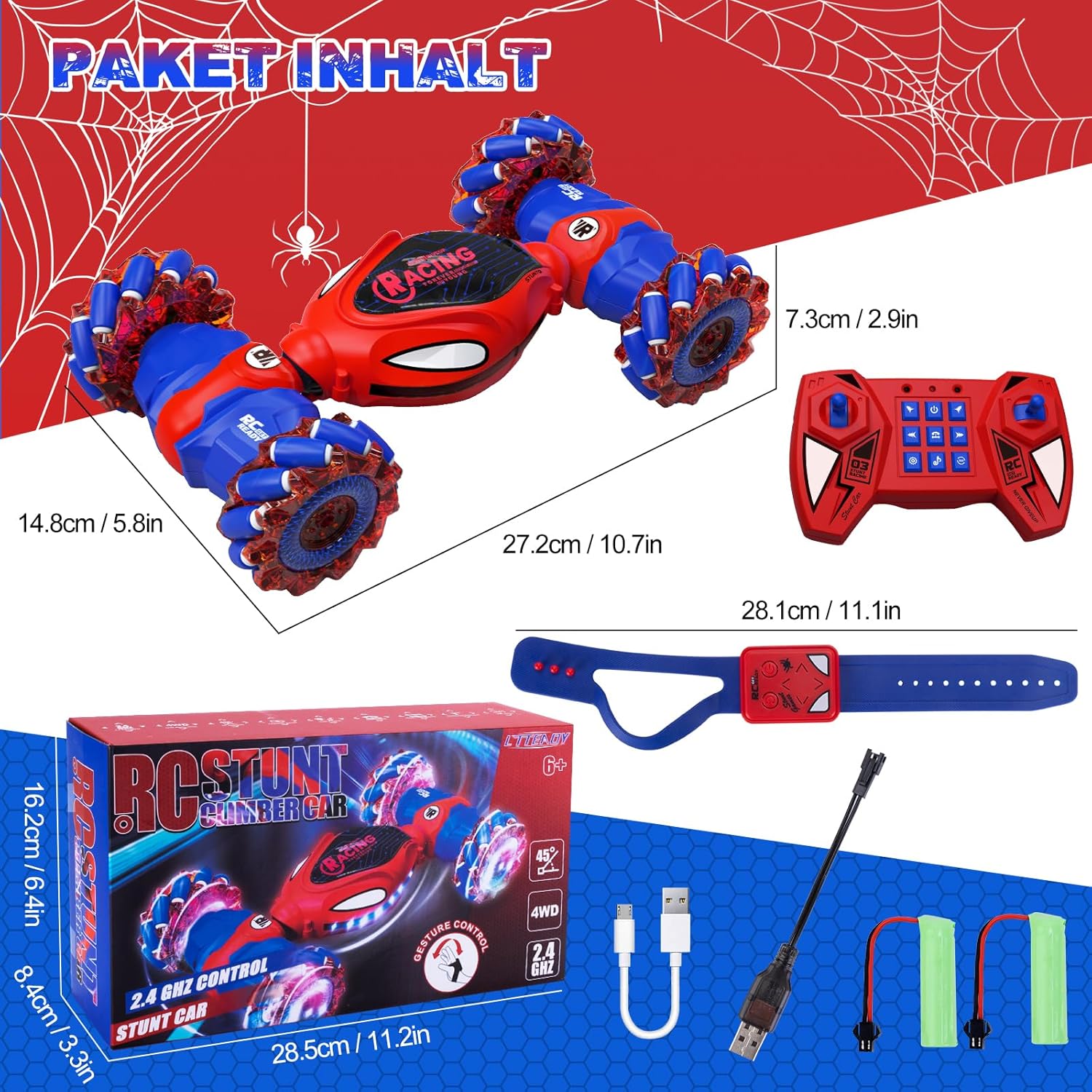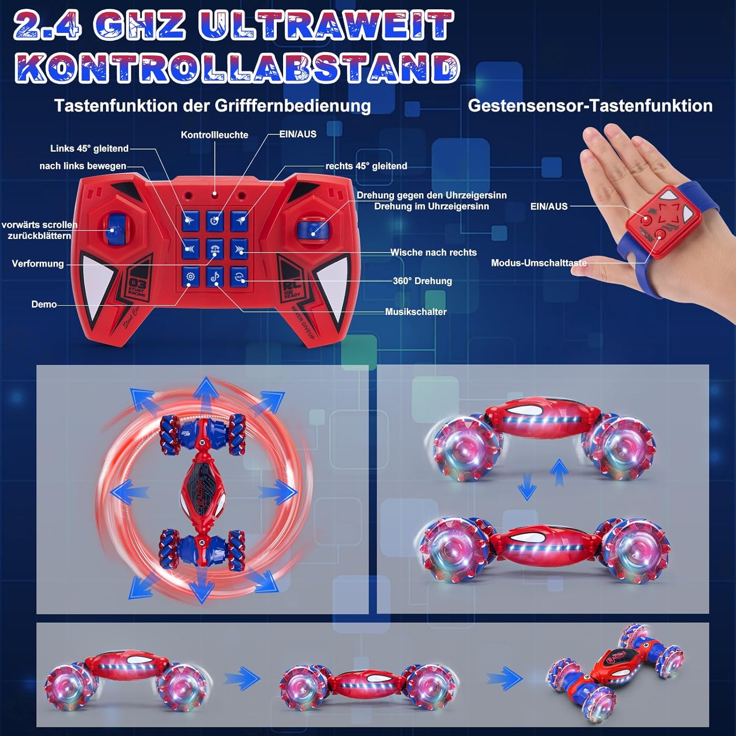 - đźă2.4GHz Funk-Handgelenksteuerungă:Neben der traditionellen Fernbedienung unterstĂŒtzt dieses ferngesteuerte Auto auch die Handgelenksteuerung.Kinder können das Auto mit einem Handgelenk-Sensor durch Handbewegungen steuern und anspruchsvolle
