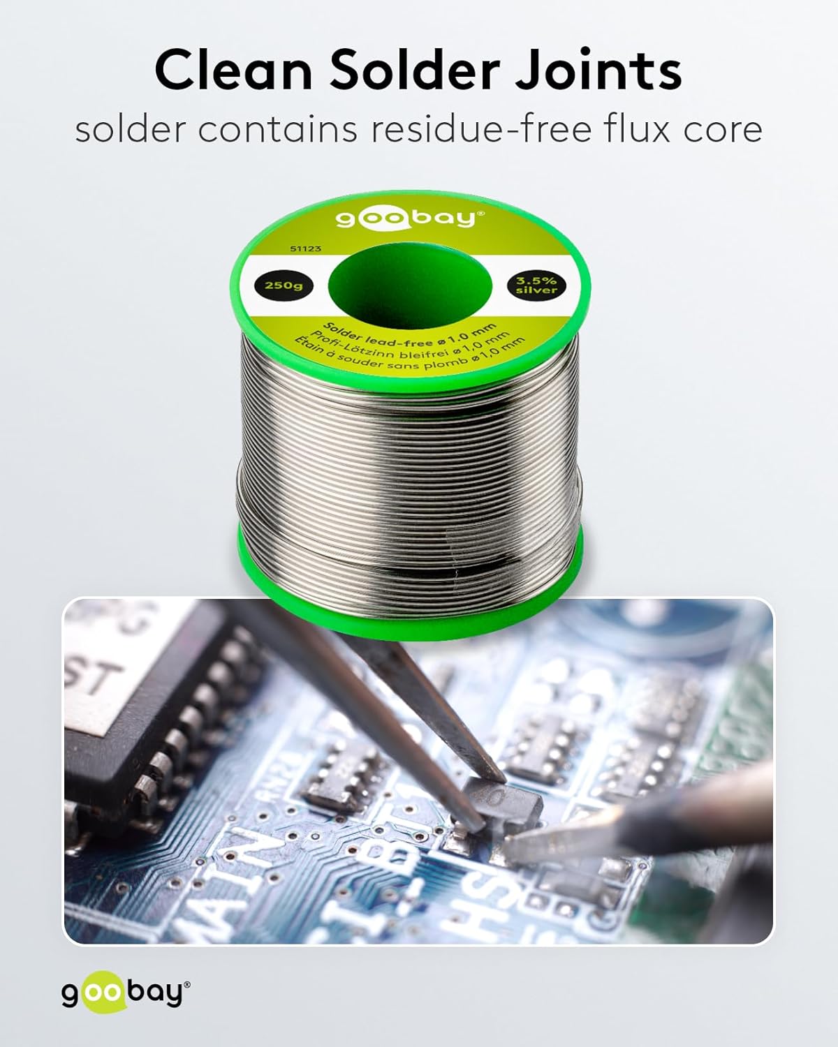 - Rolle 250g bleifreies Lötzinn mit 1mm Durchmesser; Lötmaterial mit 3,5 % Silber / 0,7 % Kupfer / 93,8 % Zinn / 2,0 % Flussmittel / 217° C Schmelzpunkt; Silberlot ist frei von jeglichen Halogenen