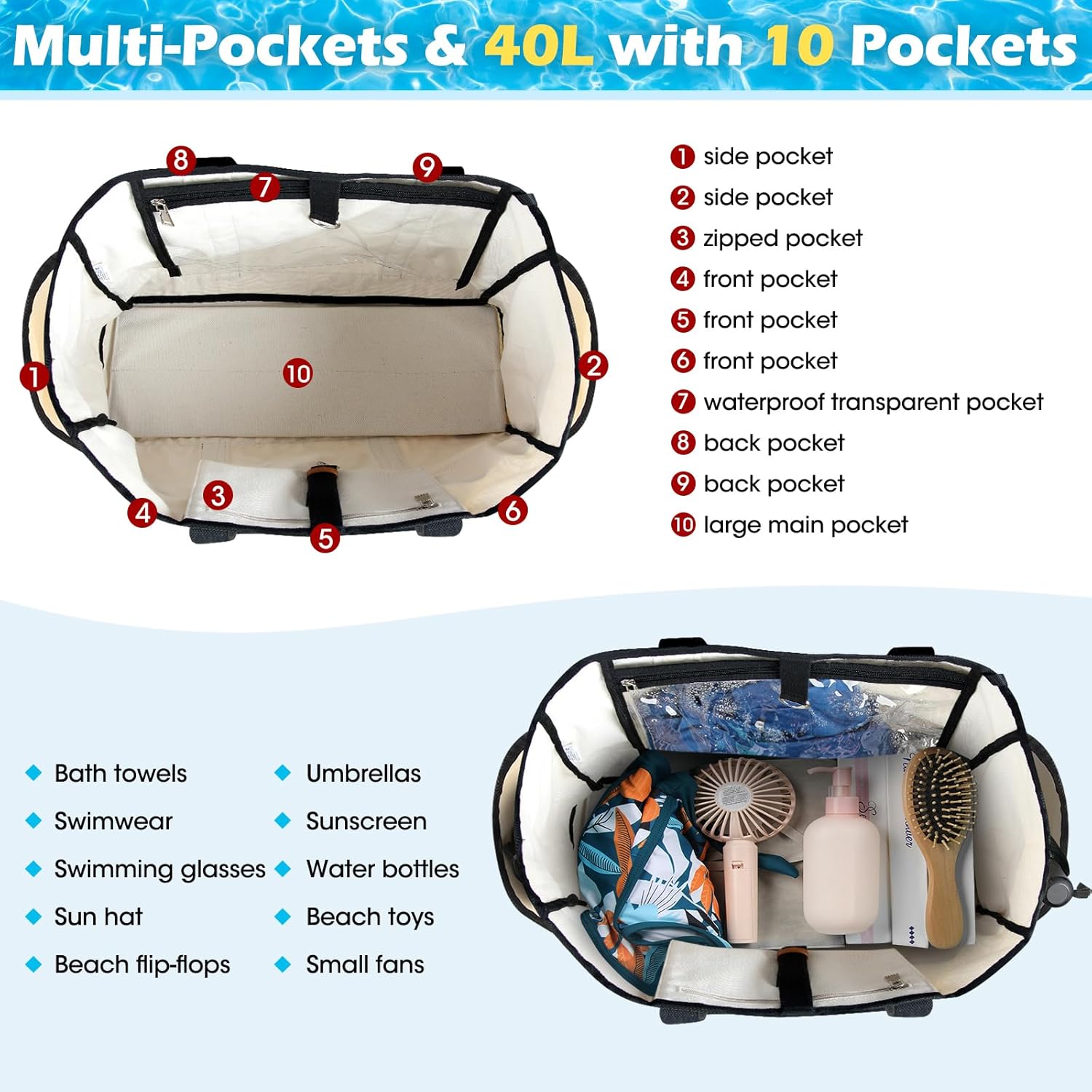 - 🏝【Aufbewahrungsideen】grosse Tasche für Badetücher, Badebekleidung, Taschentücher, etc. Innere Reissverschlusstasche für Mobiltelefon und Geldbörse. Wasserdichte Innentasche zur Aufbewahrung von nassen Handtüchern, Badekappen usw.