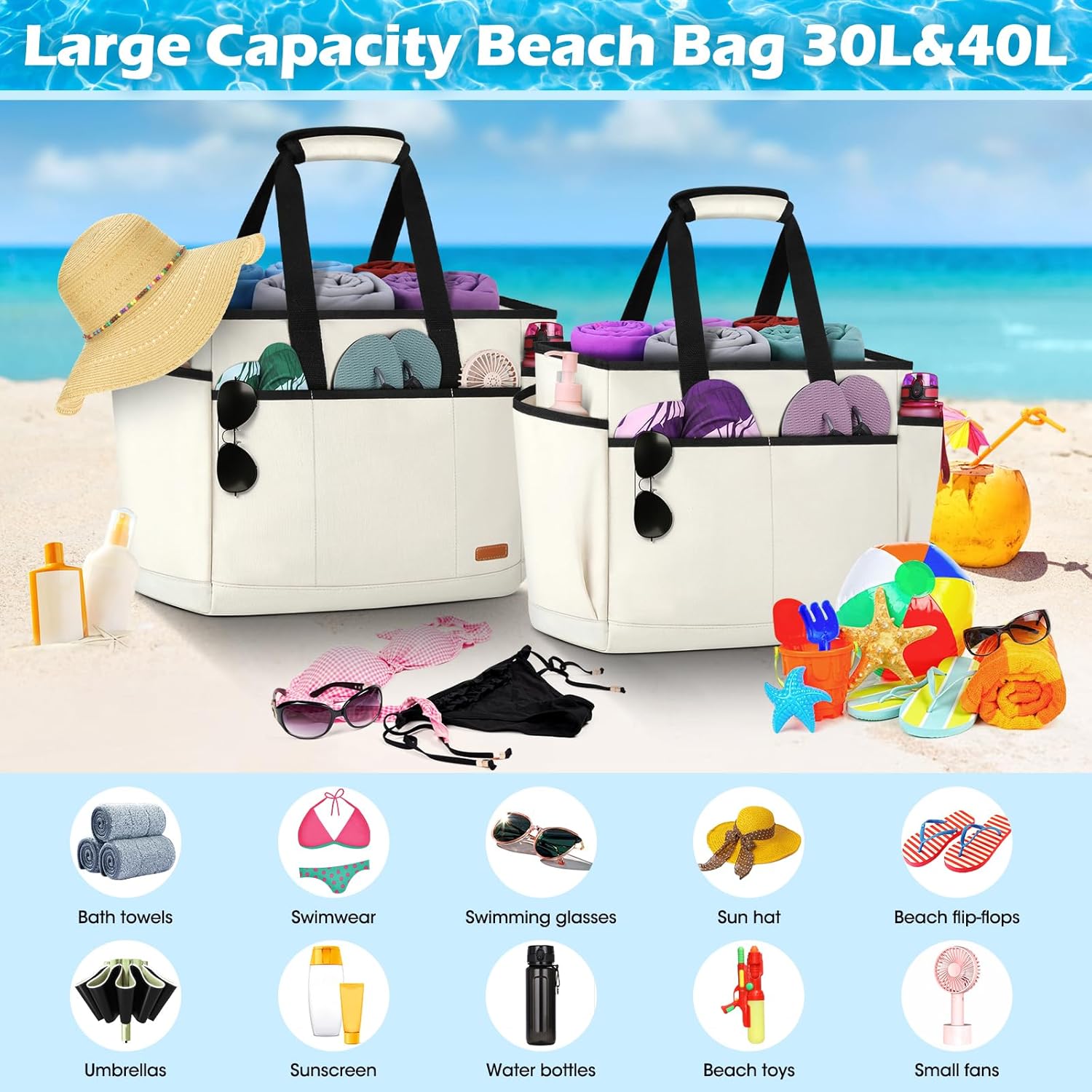 - 🏝【Strandtasche xxl familie】Die 30-Liter-strandtasche xxl misst 38 cm*18,5 cm*35 cm, wiegt 0,8 kg und hat 7 Taschen. Die 40-Liter-strandtasche xxl misst 48 cm*20 cm*35 cm, wiegt 0,95 kg und hat 10 Taschen.