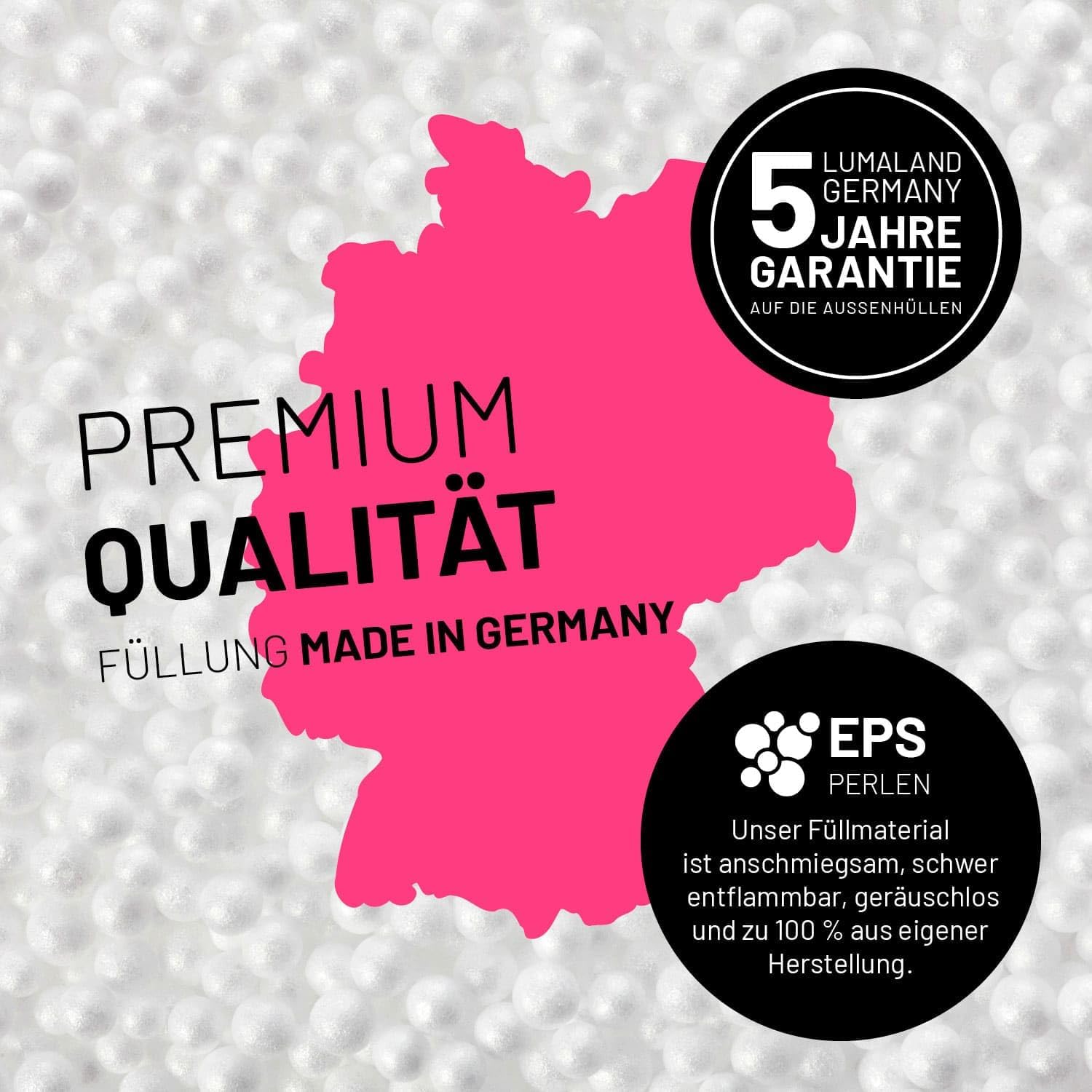 • Dieser exklusive Beanbag passt sich dank der hochwertigen eigens für Lumaland hergestellten EPS Füllung perfekt der Körperform und Körperhaltung an. Bei der Füllung handelt sich um Neuware weisser Styroporkügelchen aus deutscher Herstellung. Die