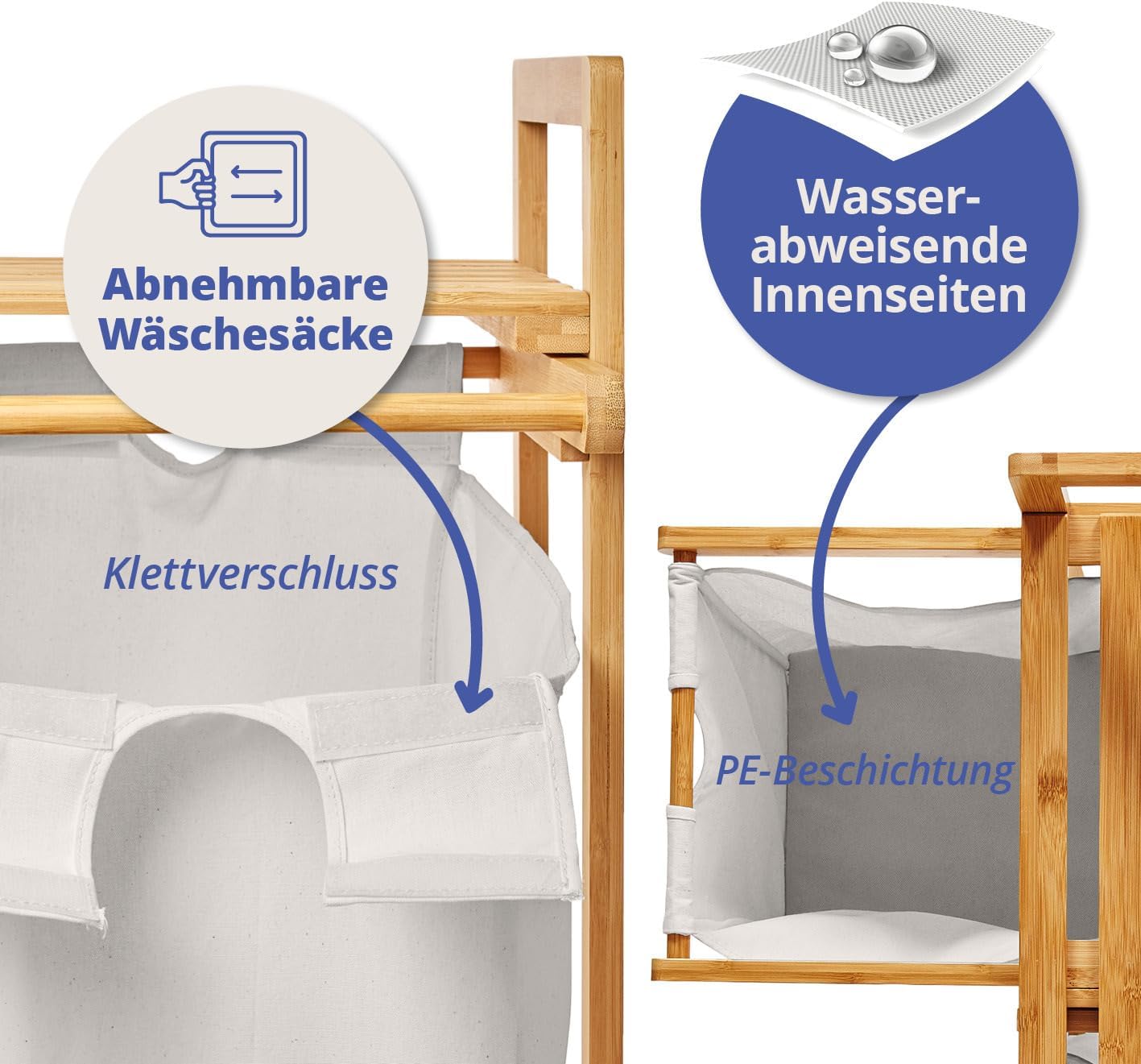 - Stilvoller und dekorativer Bambus Wäschekorb mit 2 Wäschesäcken aus Stoff. Abnehmbare Baumwollfächer mit Klettverschluss: Dank des professionell verarbeiteten Klettverschlusses lassen sich beide Baumwollfächer je nach Belieben abnehmen, transportieren und reinigen - absolut flexibel und praktisch. Sie haben die Wahl zwischen vielen schönen Farbausführungen: Beige, Weiss, Grau, Rot und Blau.