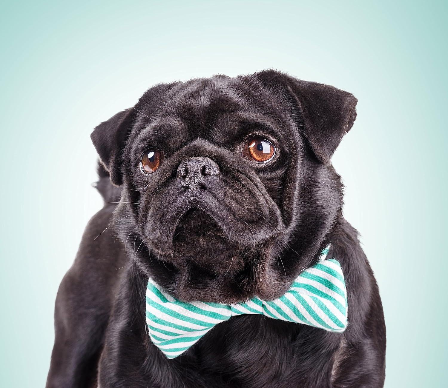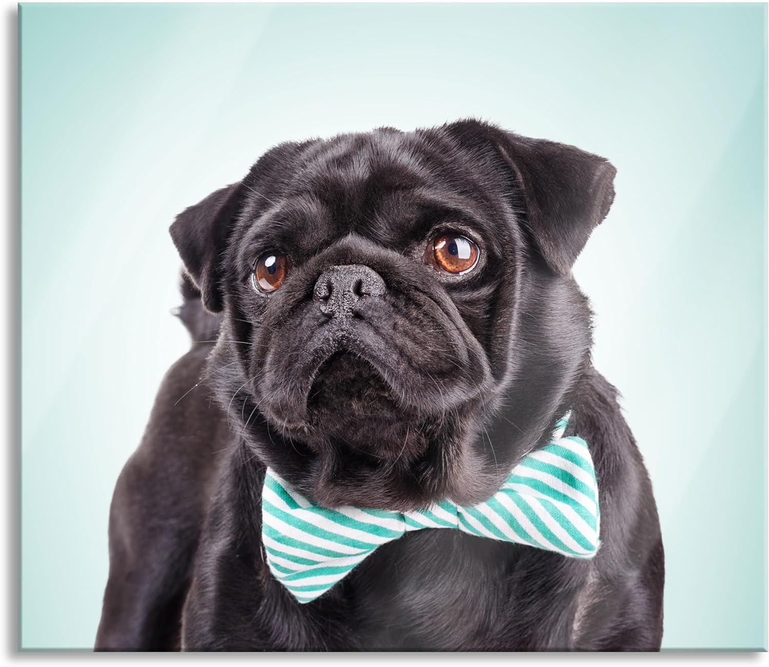 Lustiger Mops mit Fliege Herdabdeckplatte & Spritzschutz aus Echtglas | Für Herd-Kochfelder | 60x52