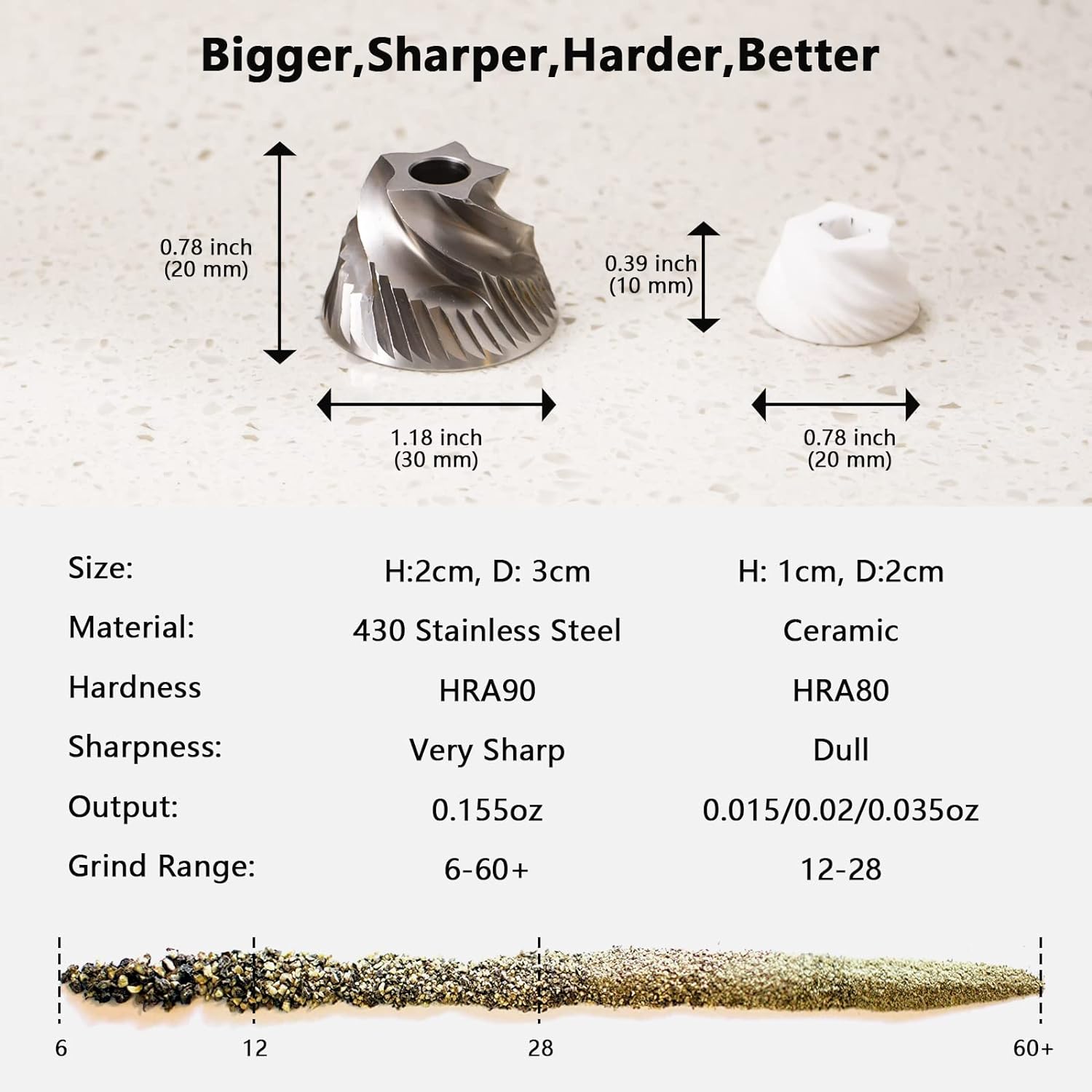 - Hochwertiges Material: Metall-Pfeffermühle ist mit schweren soliden Fräsen und eloxiertem Aluminium-Körper, und übergrosse Lager Unterstützung Antriebswelle und hohe Kohlenstoff-Edelstahl Grate, lange Lebensdauer Schleifen, vermeiden Schleifen