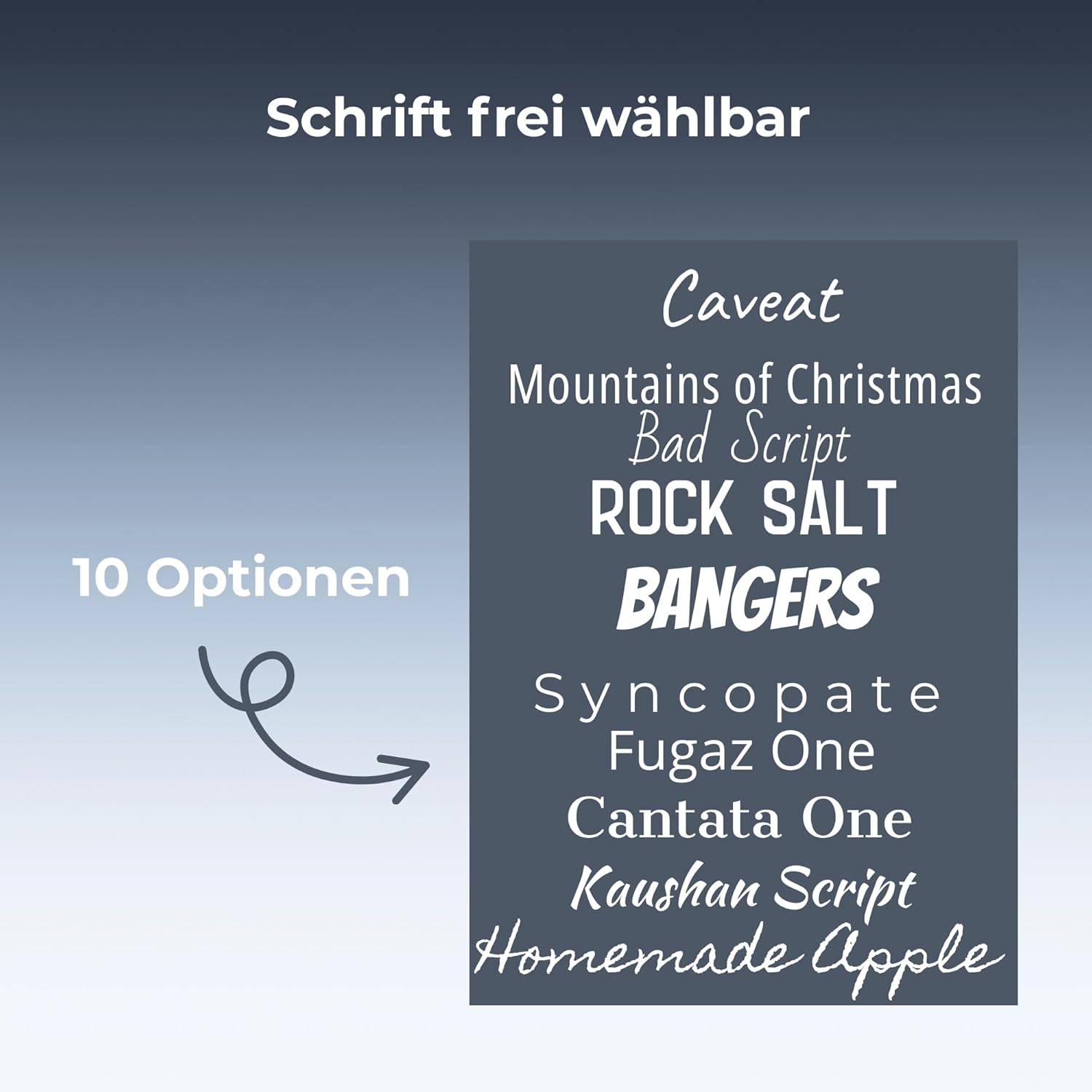 - Jedes Glas ist ein Unikat. Wähle aus unseren 10 verschiedenen Schriftarten und vergebe individuelle Namen, Positionen, Spitznamen und sonstige Bezeichnungen.