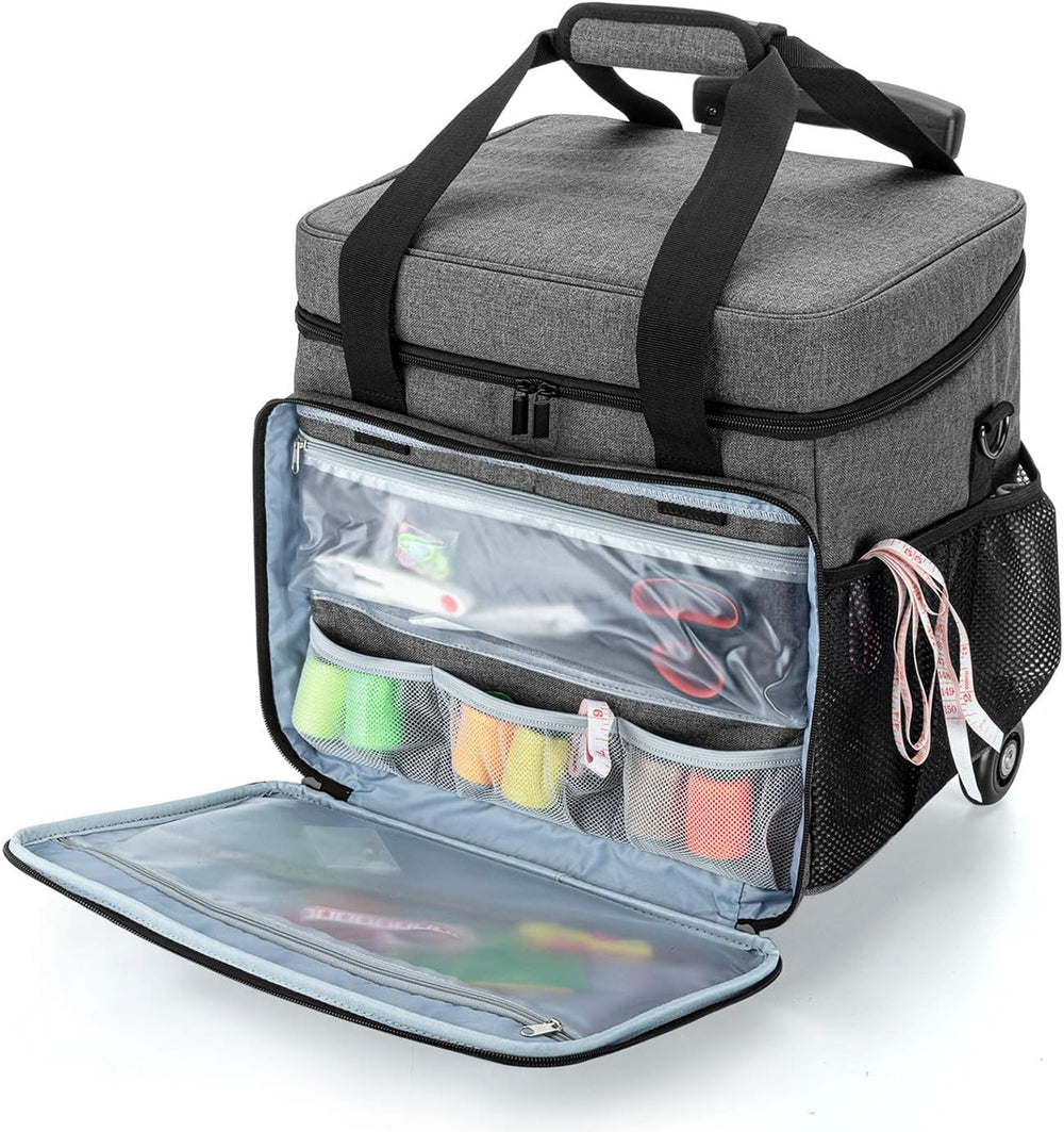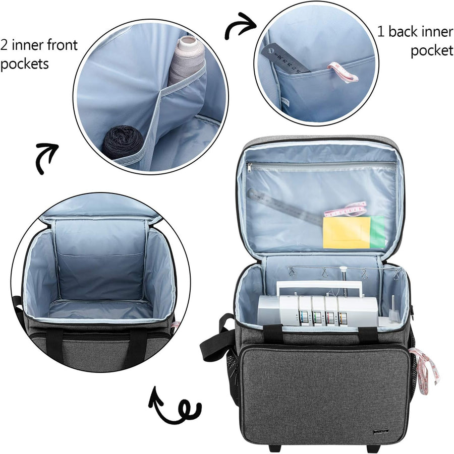 - HAUPTABTEIL: Das weit geöffnete Design erleichtert das Ein- und Ausziehen Ihrer Serger-Nähmaschine (Hinweis: Bei Verwendung dieser Tasche müssen Sie die Höhe des hinteren Gewindespindelhalters anpassen). 1 durchscheinende Reissverschlusstasche und 3