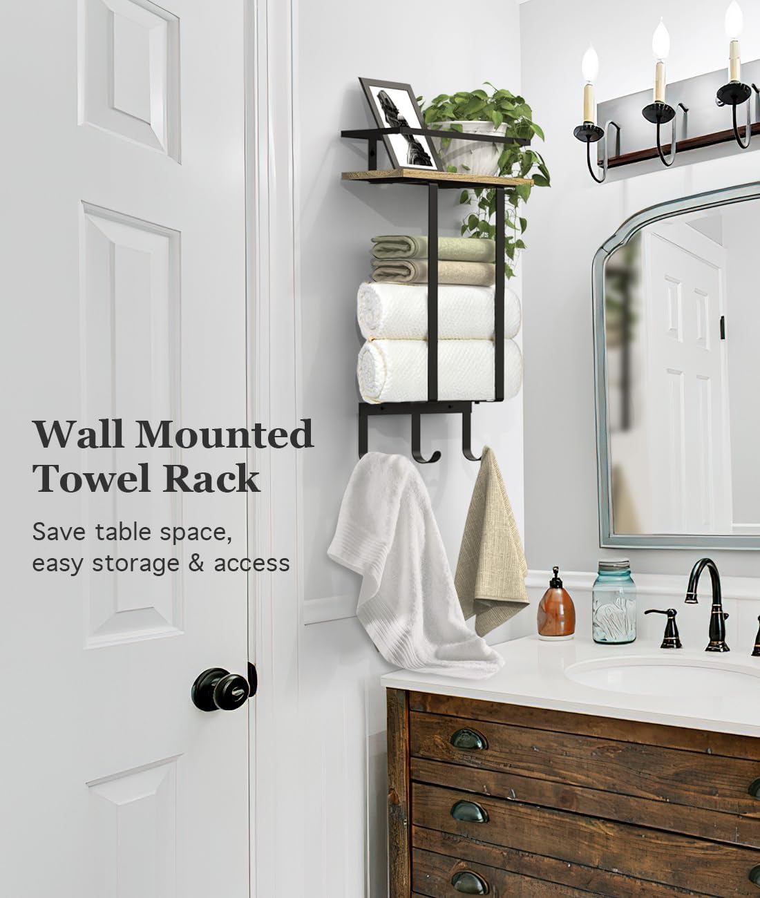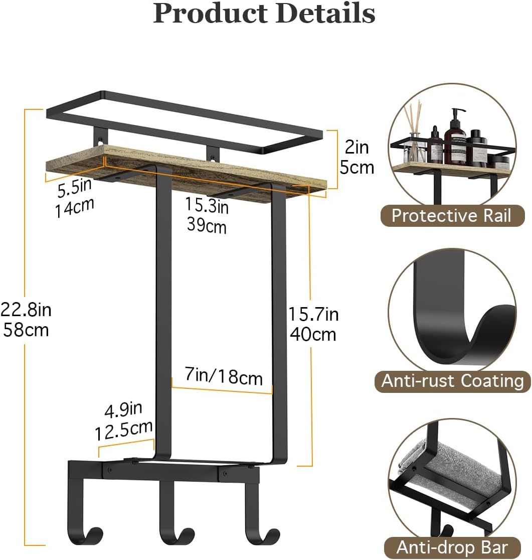 • 【Handtuchregal Bad Organizer】 Der Badezimmer Handtuchhalter mit mattschwarzer Rostschutzbeschichtung besteht aus verdicktem Eisen und natürlichem, umweltfreundlichem Holz. Es ist wasserdicht, sturzfest und langlebig genug, um im Badezimmer lange zu