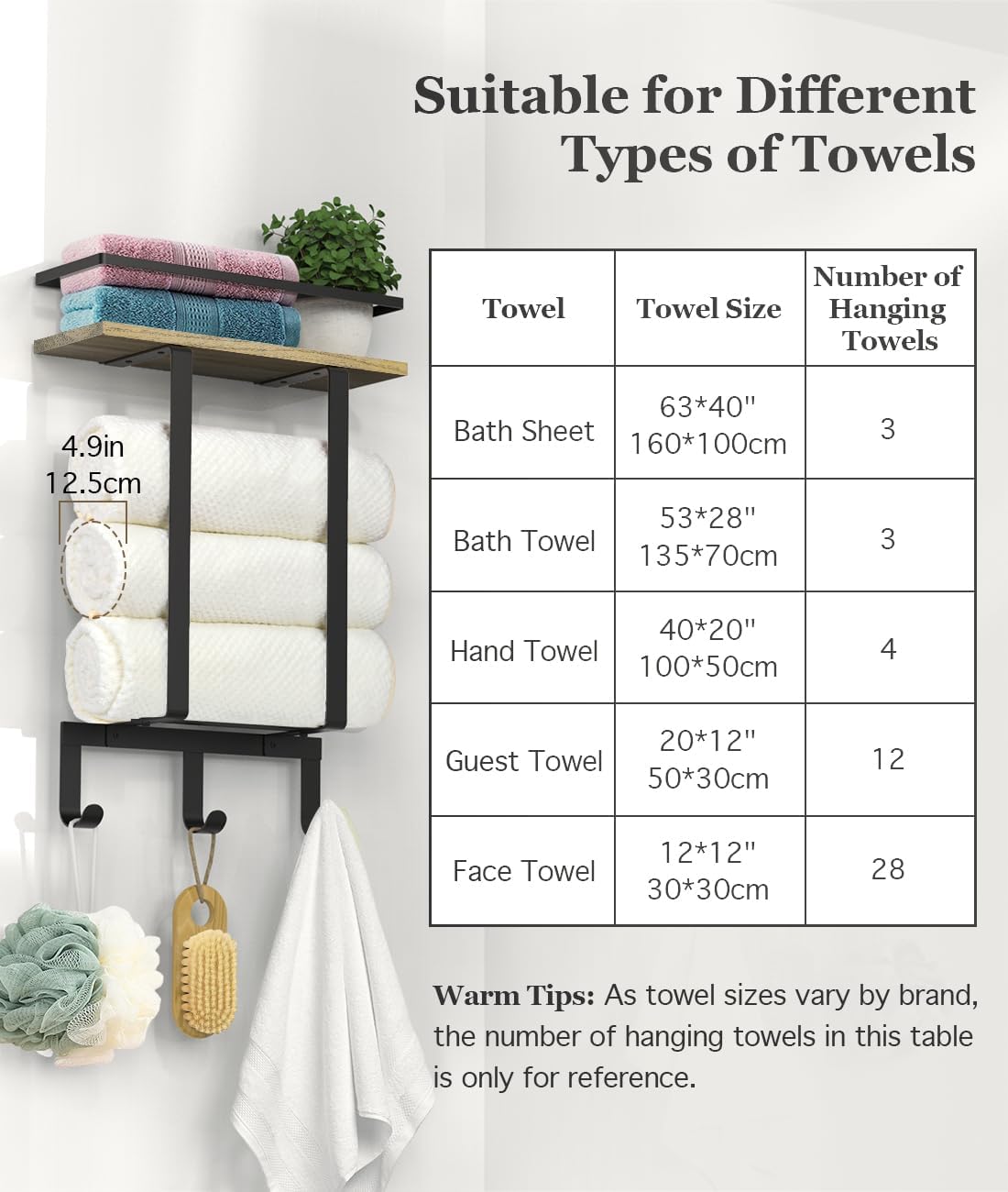 • 【Geeignet für Heimgebrauch】 Der an der Wand montierte Handtuchhalter ist einzigartig und modern und passt zu verschiedenen Badezimmerdekorationsstilen. Die Grösse des an der Wand montierten Handtuchhalters beträgt 20,5 x 40 cm/8 x 15,7 Zoll und