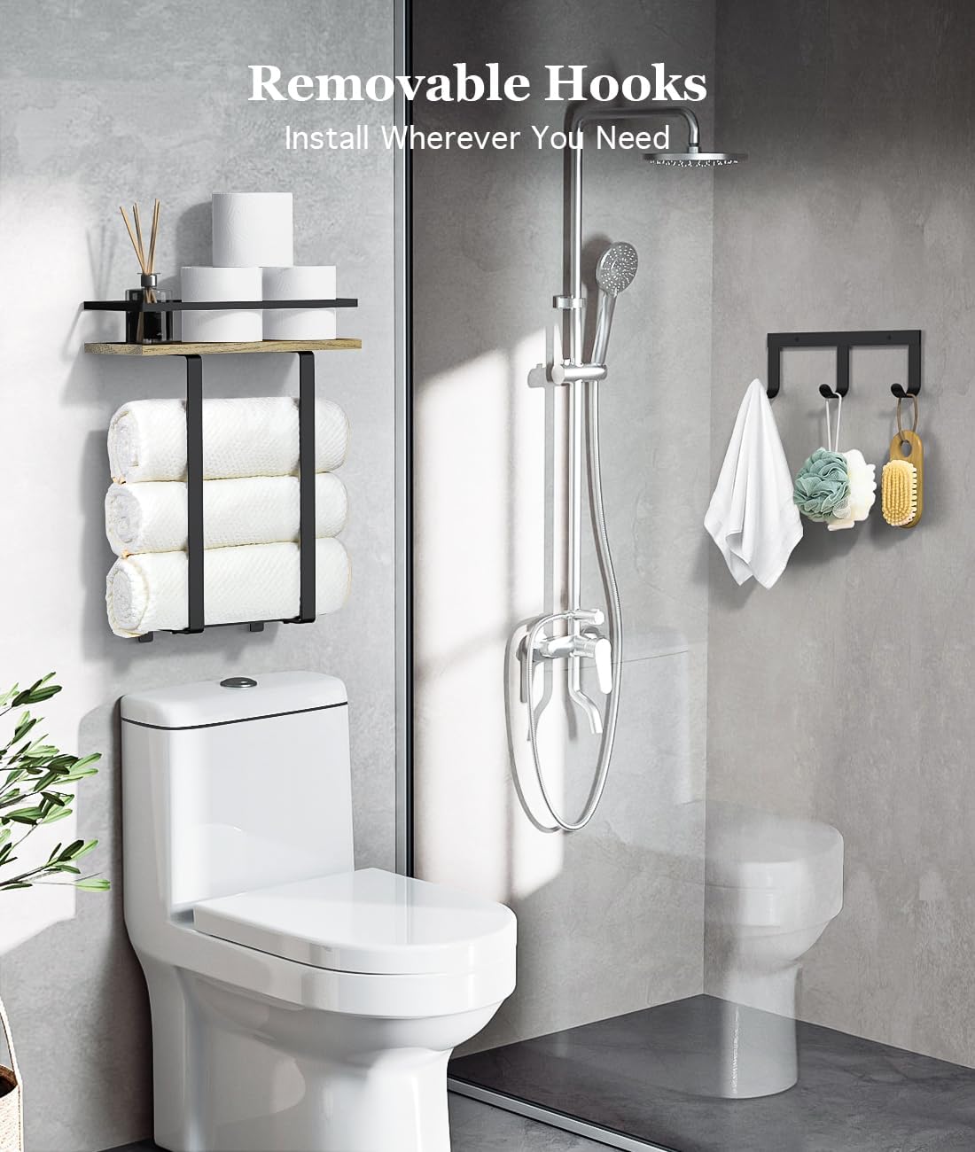 • 【Handtuchhalter & Schweberegale】 Unter dem Handtuchhalter befinden sich 3 Haken, er ist abnehmbar und kann separat verwendet werden. Und oben gibt es ein Wandregal mit Absturzsicherungsgeländer. An den Haken können Sie Handtücher, Handtücher,