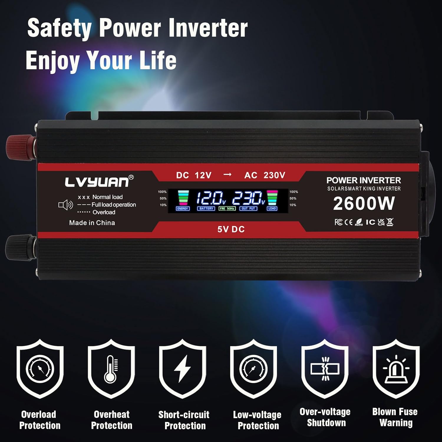 - Achtfache Schutzfunktionen: Verpolungsschutz, Kurzschlussschutz, Überhitzungsschutz, Überspannungsschutz, Überlastschutz, Unterspannungsschutz, Überstromschutz und Stossschutz. Der Wechselrichter von 12V auf 230V verfügt über ein intelligentes