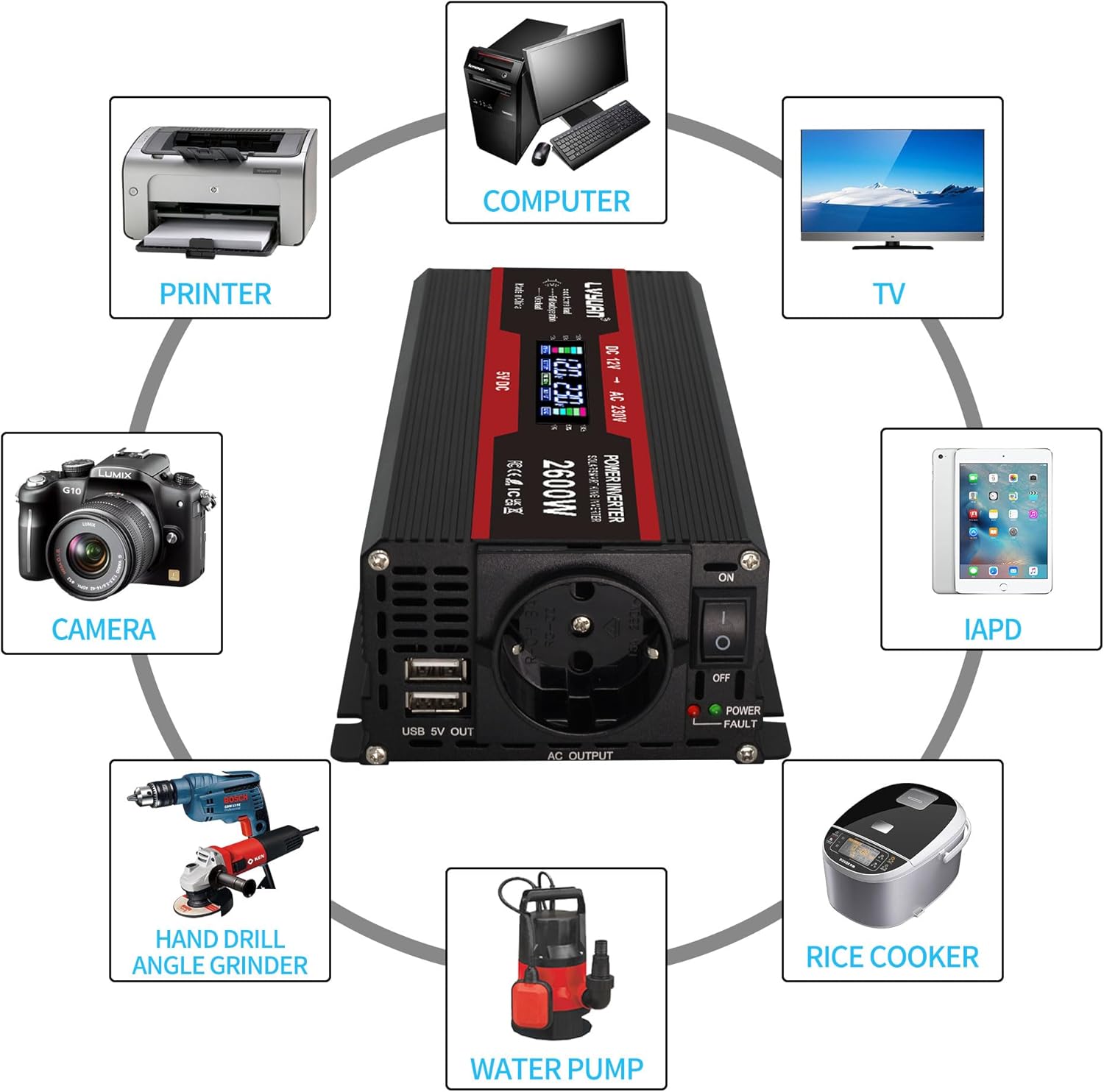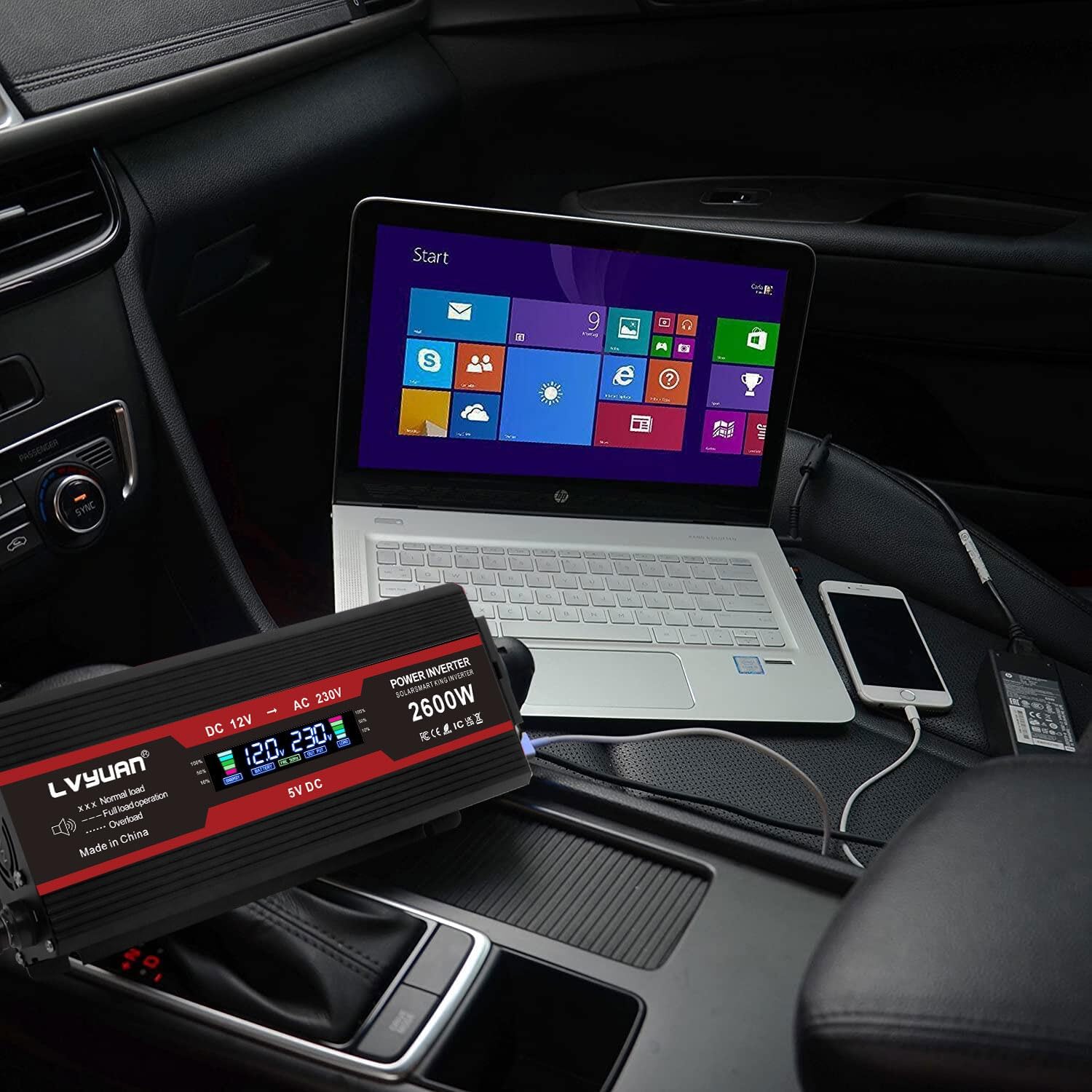 - Wechselrichter 12V zu 230V: LVYUAN Wechselrichter 12V auf 230V ist mit einem AC-Stecker und zwei USB Anschlüssen ausgestattet und bietet sichere und zuverlässige Stromversorgung für Handy, Laptop, Ventilator, Lampen, DVD-Player, GPS, Kameras und