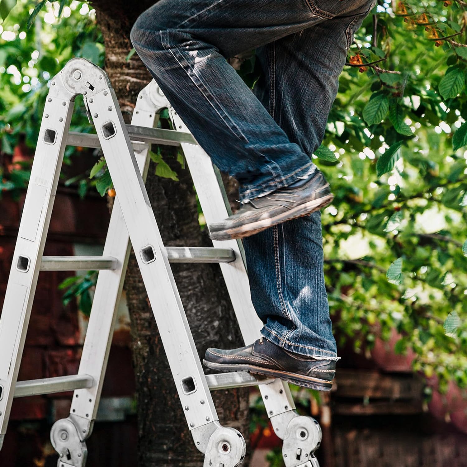 - Sicherheitsverriegelung mit mehreren Positionen, konfigurieren Sie die Leiter nach Ihren Wünschen. Kann als einzelne Leiter, doppelseitige Leiter, Bock, Arbeitsplattform, Treppenleiter etc. verwendet werden.