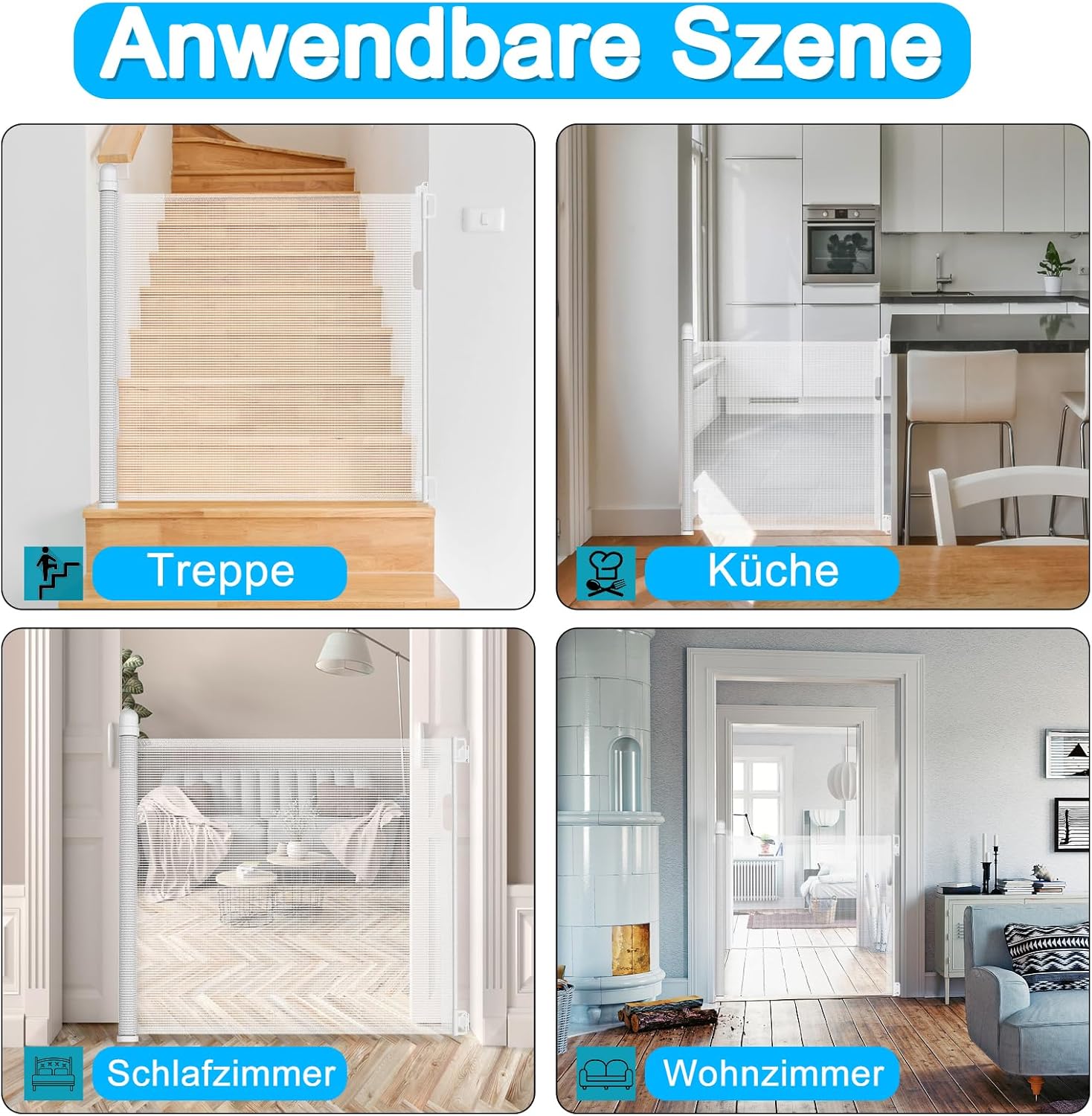 - 【Ausziehbares design】 Diese kinderschutzgitter für treppen ist bis zu 180 cm Breite ausziehbar und ist 87 cm hoch. Einziehbares türschutzgitter kann bei Nichtgebrauch komplett eingezogen werden, wodurch Sie Platz sparen.