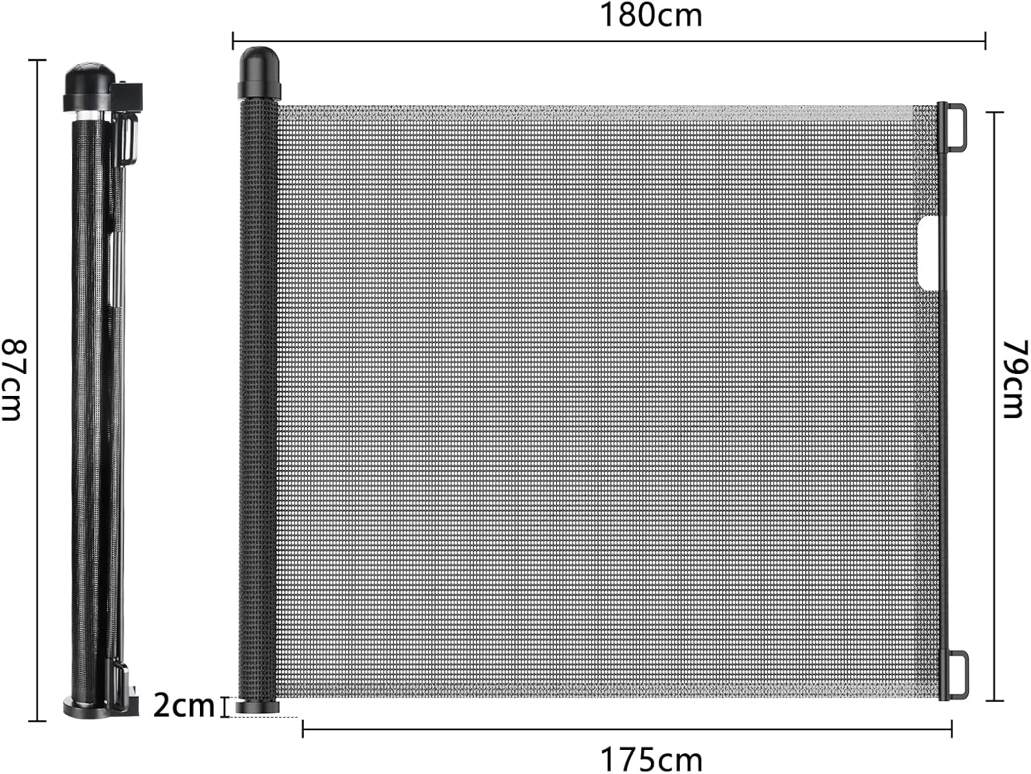- 【Ausziehbares design】 Diese kinderschutzgitter für treppen ist bis zu 180 cm Breite ausziehbar und ist 87 cm hoch. Einziehbares türschutzgitter kann bei Nichtgebrauch komplett eingezogen werden, wodurch Sie Platz sparen.