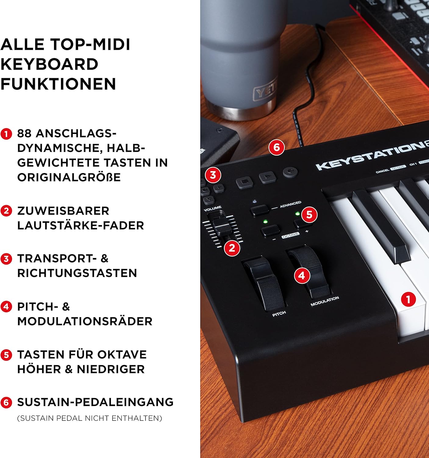 - Essenzielle Musikproduktion – MIDI Keyboard Controller mit 88 anschlagsdynamischen, halbgewichteten Tasten für MIDI-Kontrolle von virtuellen Instrumenten, Software-Samplern und Plugin-Synthesizern