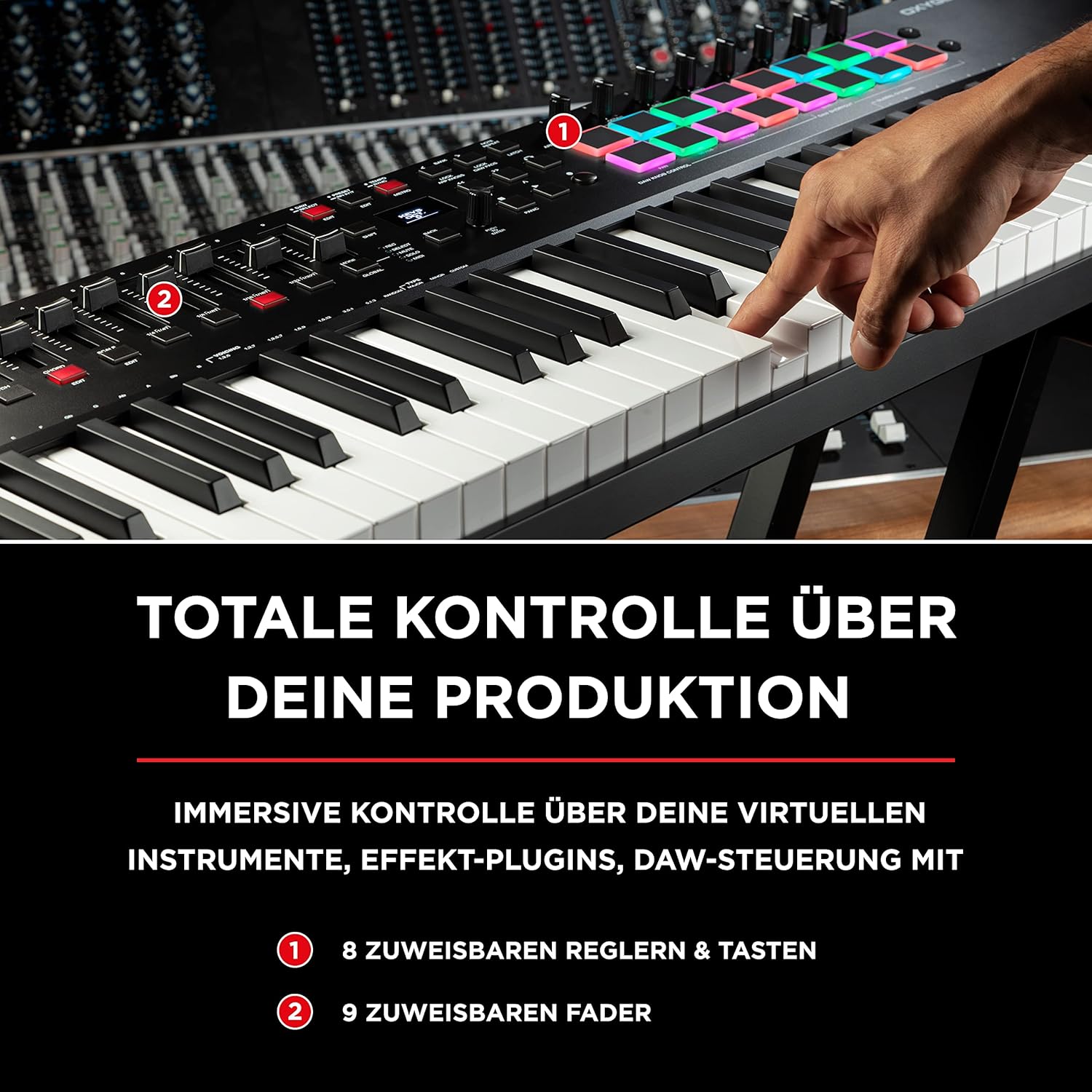 - Essenzielles MIDI Keyboard - 61 anschlagsdynamische, halbgewichtete Tasten mit Aftertouch und zuweisbaren Zonen für das Spielen von virtuellen Sampler-Instrumenten und Synthesizer-Plugins
