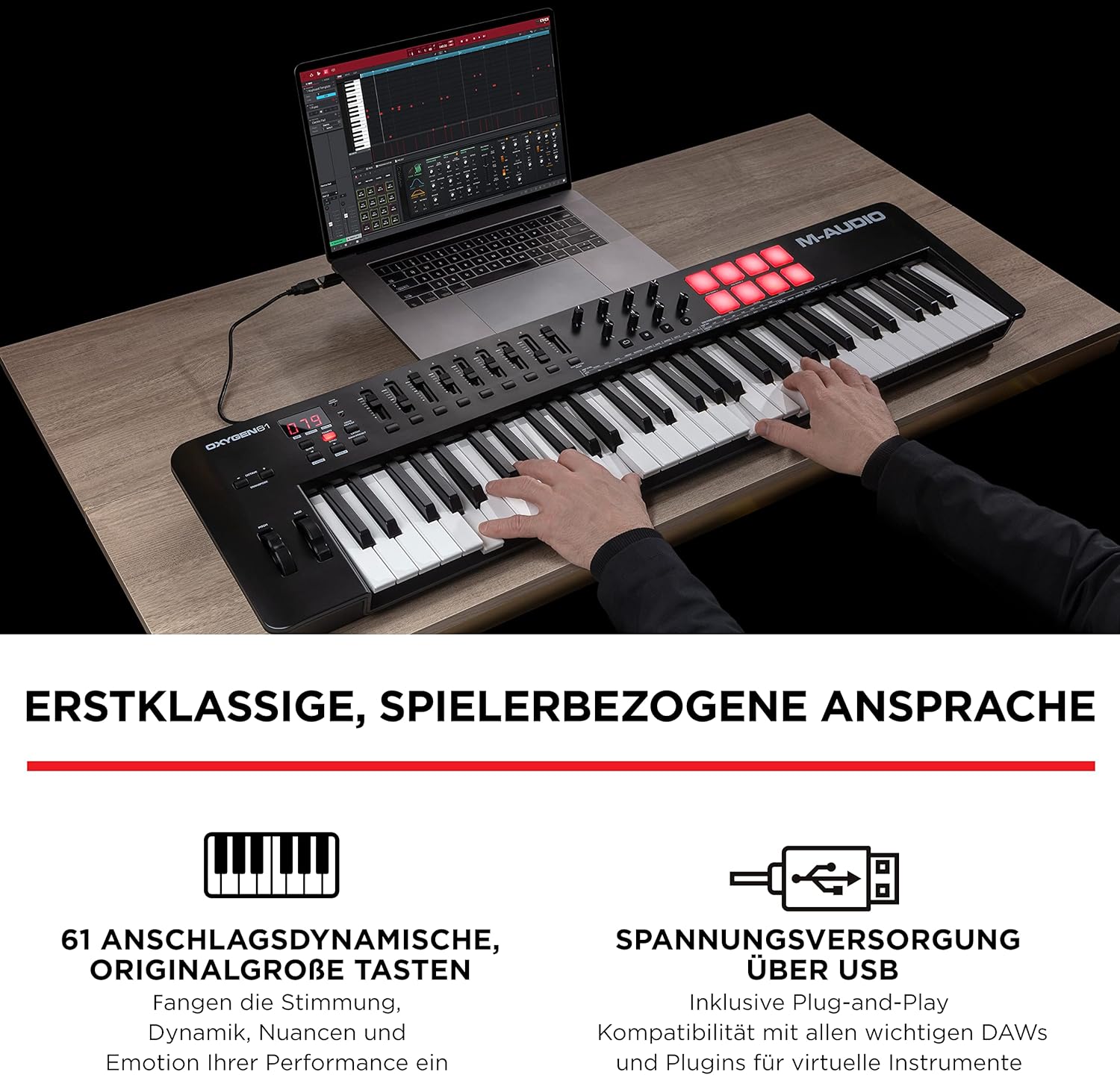 - Modernes Studiozubehör - MIDI Controller mit 61 anschlagsdynamischen, originalgrossen Tasten im Klavierstil liefern eine natürliche Ansprache, ideal für virtuelle Sampler- & Synthesizer-Plugins