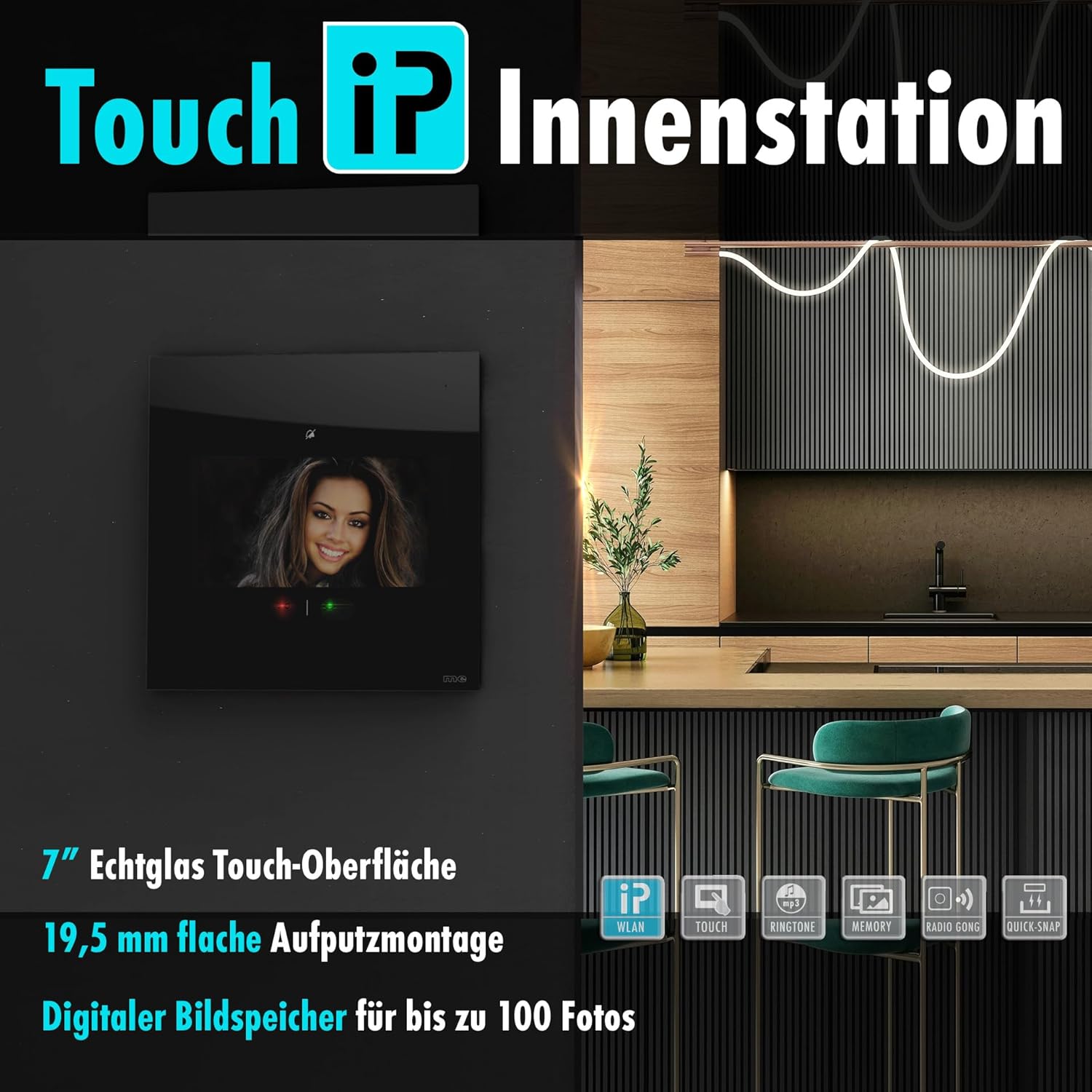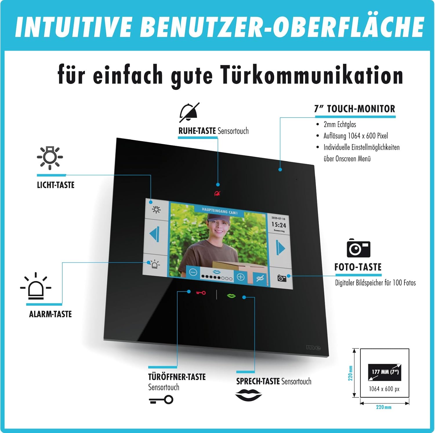 - ECHTGLAS-FRONTPANEL – Tür Videosprechanlage (innen) in schwarzem Kunststoffgehäuse mit 2mm Echtglas-Frontpanel und digitalem Bildspeicher für bis zu 100 Fotos mit Datum und Uhrzeit. Der 177mm (7") grosse kapazitive Monitor bietet TOUCH-FUNKTION FÜR