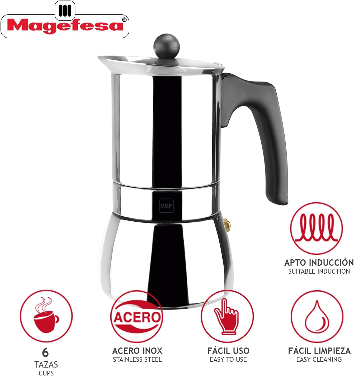 - Edelstahl: Die Familie Maggefesa Genova ist komplett aus hochwertigem Edelstahl gefertigt. Sie sind aus extrem widerstandsfähigen Materialien hergestellt, die die höchsten Ansprüche auf Qualität und Haltbarkeit bestanden haben.