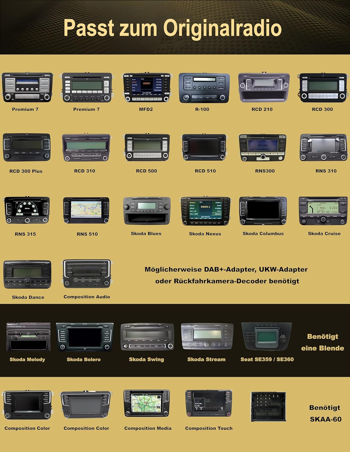 • Skoda: Fabia II 04/2007-2014, Octavia II 06/2004-2013 (evtl. neue Blende erfdl.), Praktik ab 04/2007, Rapid 2012-2015 (evtl. Blende erfdl.), Roomster ab 04/2006, Superb II 2008-2015 (evtl. Blende erfdl.), Yeti ab 06/2009 (evtl. Blende erfdl., ab 2015 evtl. Quadlock-Adapter) Seat: Alhambra ab 2010 (ab 2015 evtl. Quadlock-Adapter erfdl.), Altea ab 05/2004, Altea XL ab 04/2006 (Blende erfdl.), Leon II 09/2005-10/2012, Toledo 12/2004-2015 (bis 2012 Blende erfdl.)