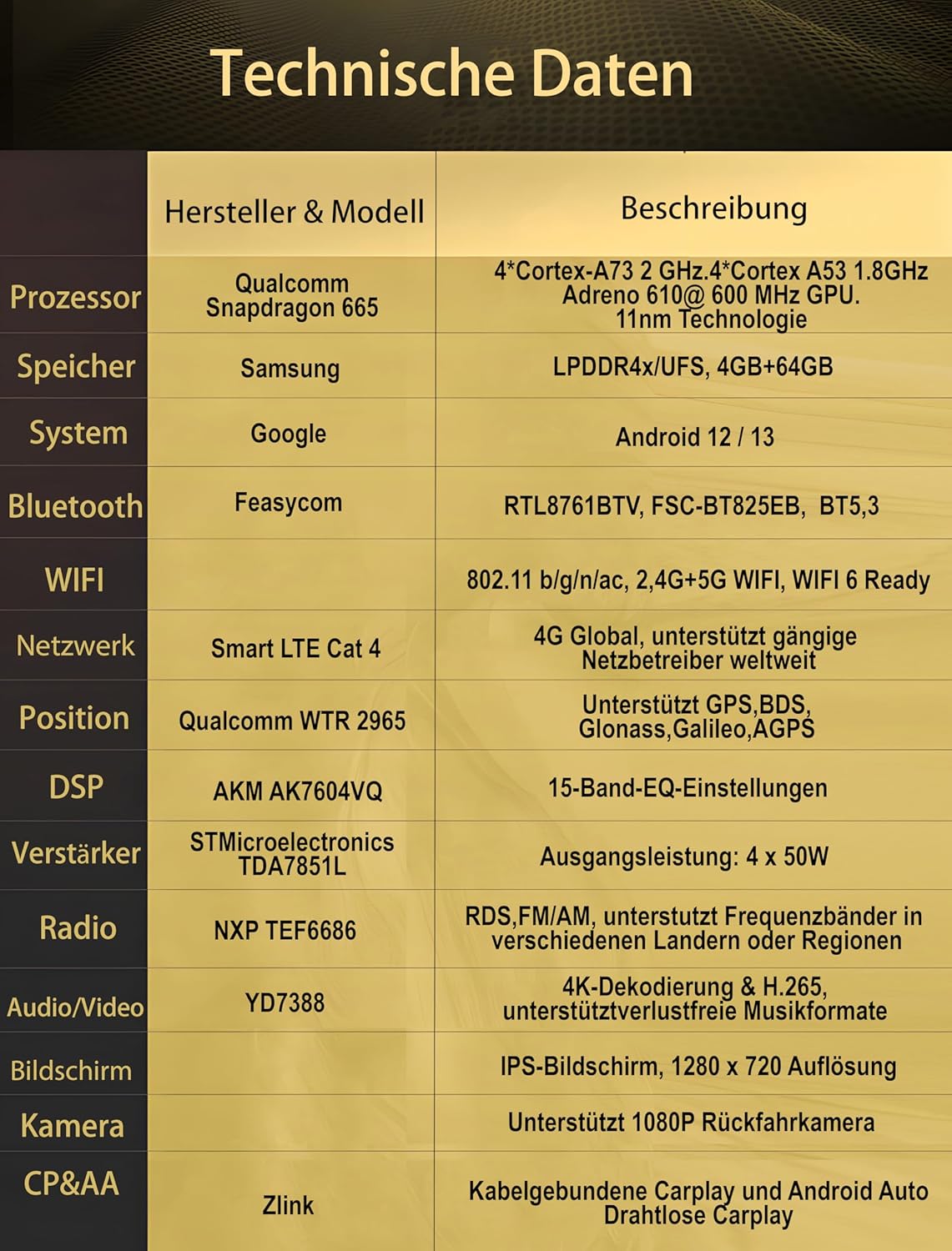 • Top-Hardware: Snapdragon 665: Qualcomm QCM6125 : 4 x A73 2,0g + 4*A53 1,8g, 4 GB (RAM), 64 GB (ROM), AHD, DSP mit 15-Band-EQ,neu entwickeltes Panzerglas IPS-Display mit grossem Blickfeld,Bluetooth 5.0 Freisprecheinrichtung, Bildschirmauflösung: 1280x720