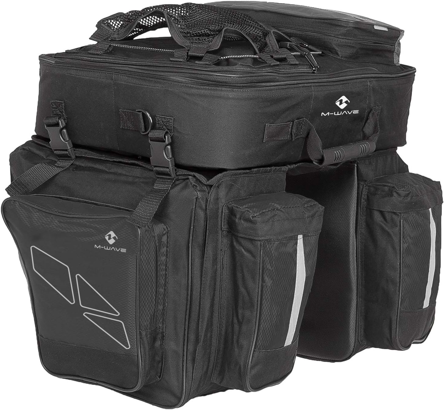 - Aufgesetzte Seitentasche und Hecktasche, mit Reflexstreifen, mit Schnellverschluss am Gepäckträger zu befestigen und Aussparungen für Gepäckträgerklemme, mit Tragegriff zwischen den Taschen