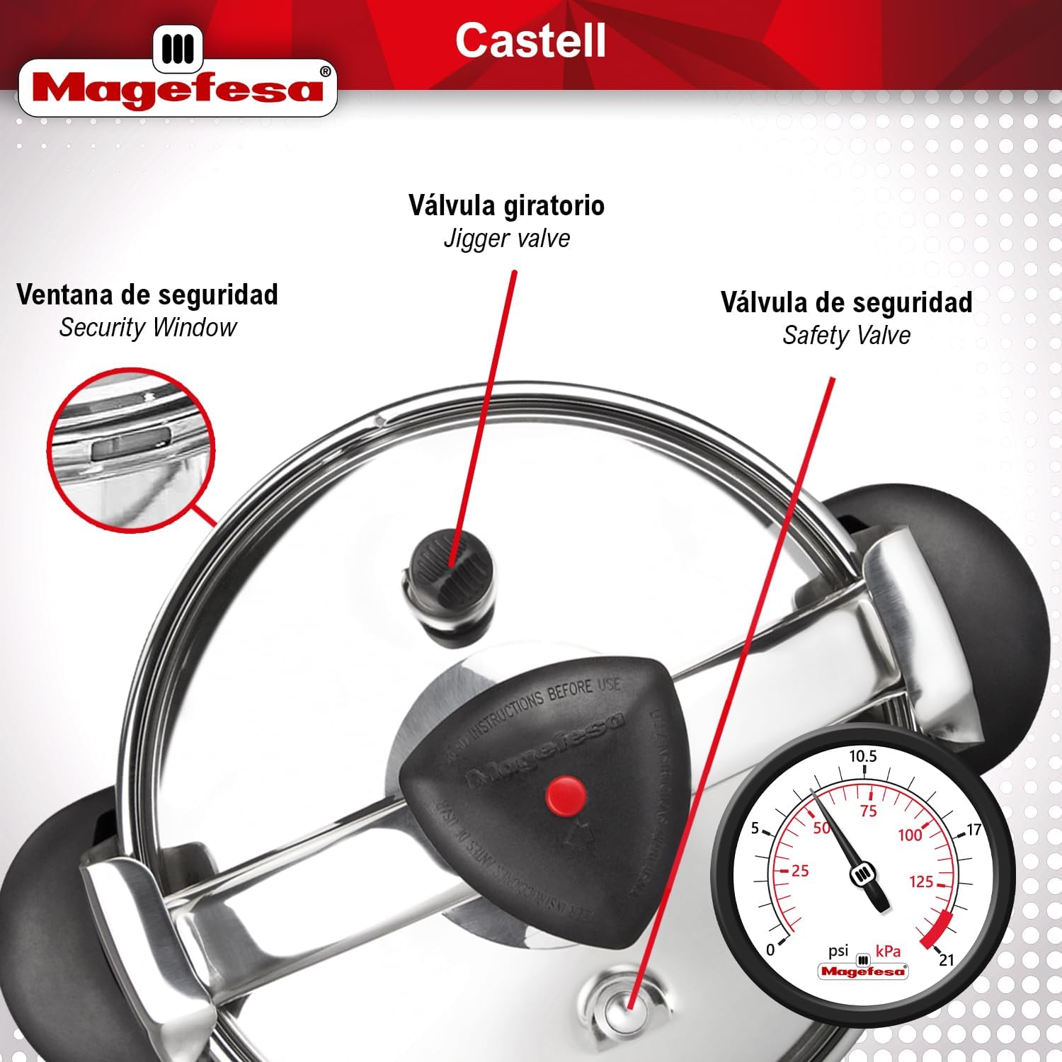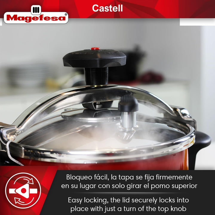 - 3 Sicherheitsvorrichtungen: Der MAGEFESA CASTELL Topf verfügt über 3 Sicherheitsmechanismen mit Drehgelenk, Kurbelventil und Sicherungsbügel; progressives Schliesssystem durch Drehknopf sorgt für eine sichere Handhabung