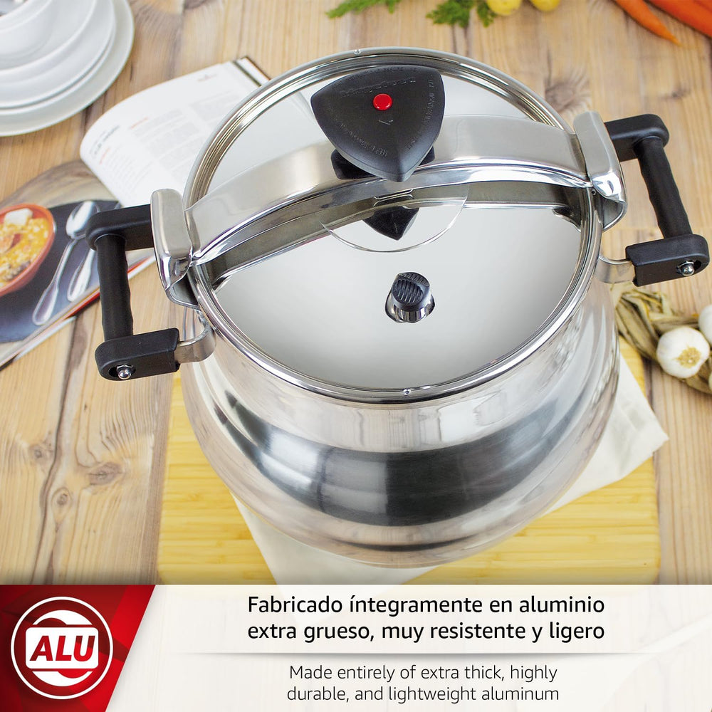 - Leicht zu bedienen: Der traditionelle Schnellkochtopf Magefesa Alustar verfügt über ein stufenloses Verschlusssystem mit Drehknopf, das eine sichere Handhabung gewährleistet. Der robuste Deckel dichtet Aromen und Nährstoffe effektiv ab. Verkürzt die