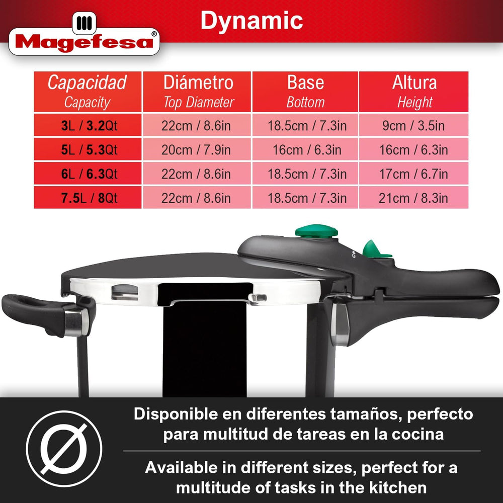 - 5 Sicherheitssysteme: Der MAGEFESA DYNAMIC Kochtopf verfügt über 5 Sicherheitssysteme Drucksensor, Sicherheit beim Schliessen, Öffnungssicherheit, Arbeitsventil, Sicherheitsventil und Sicherheitsfenster.