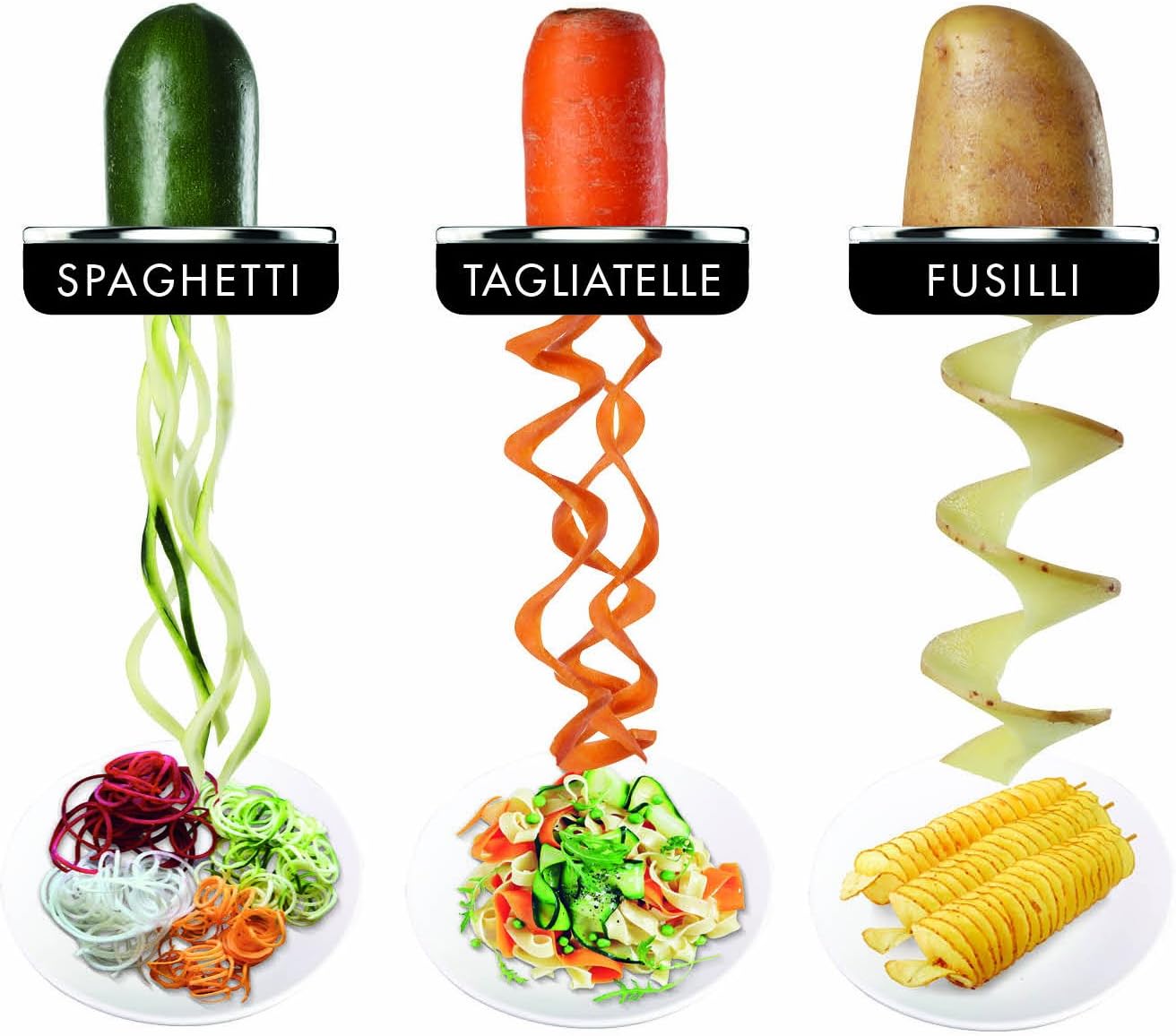 • Das Spiral Expert Set besteht aus drei Edelstahl-Zapfen, sodass Sie das Gemüse problemlos in Tagliatelle, Fusilli oder Spaghetti schneiden können