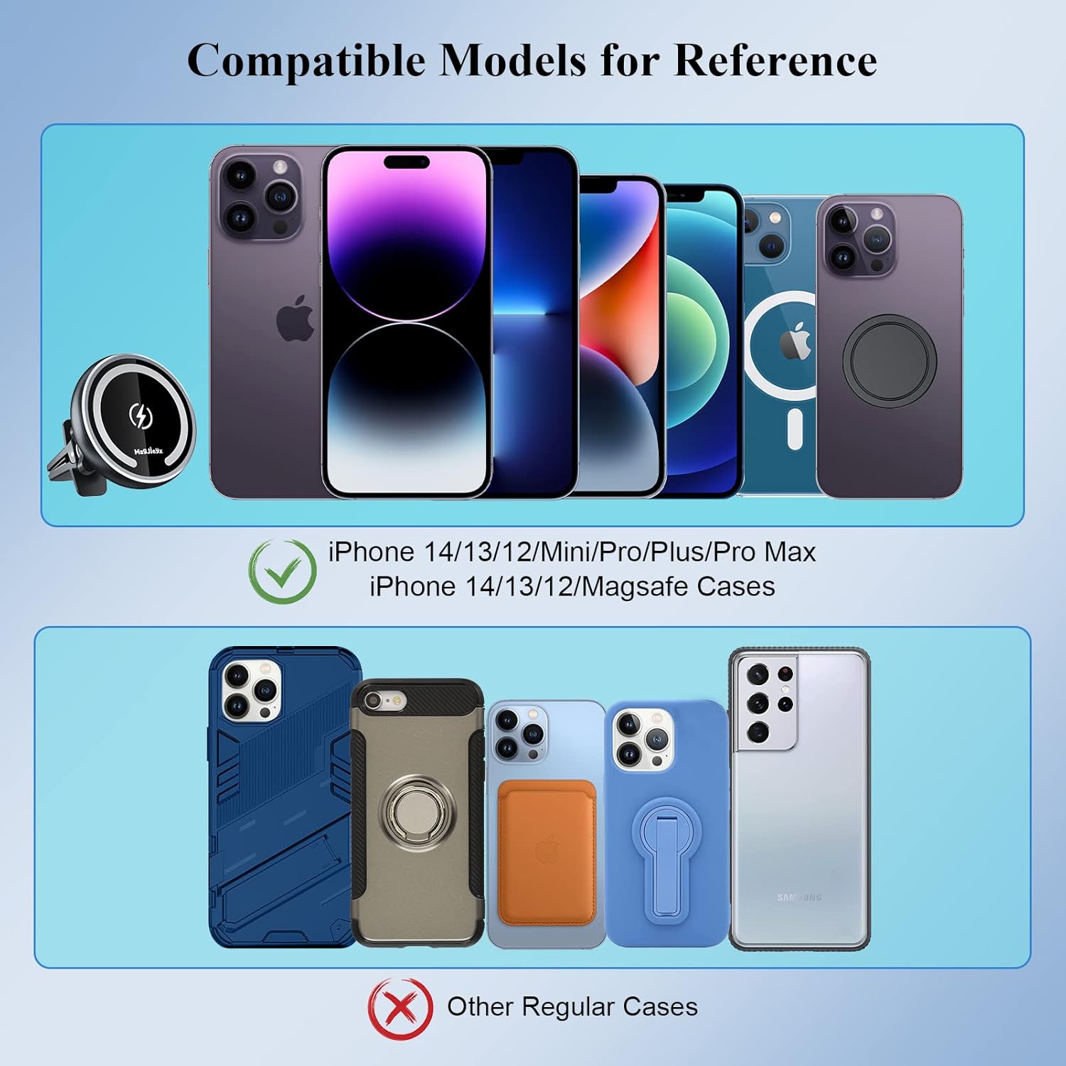 - 【Kompatibel】: Unser magsafe Autohalterung Ladegerät ist kompatibel mit iPhone15/14 Pro Max/14 Pro/14 Plus/14, iPhone13Pro Max/13 Pro/13 Plus/13/12 Pro Max/Mini/Magsafe Magnethüllen.