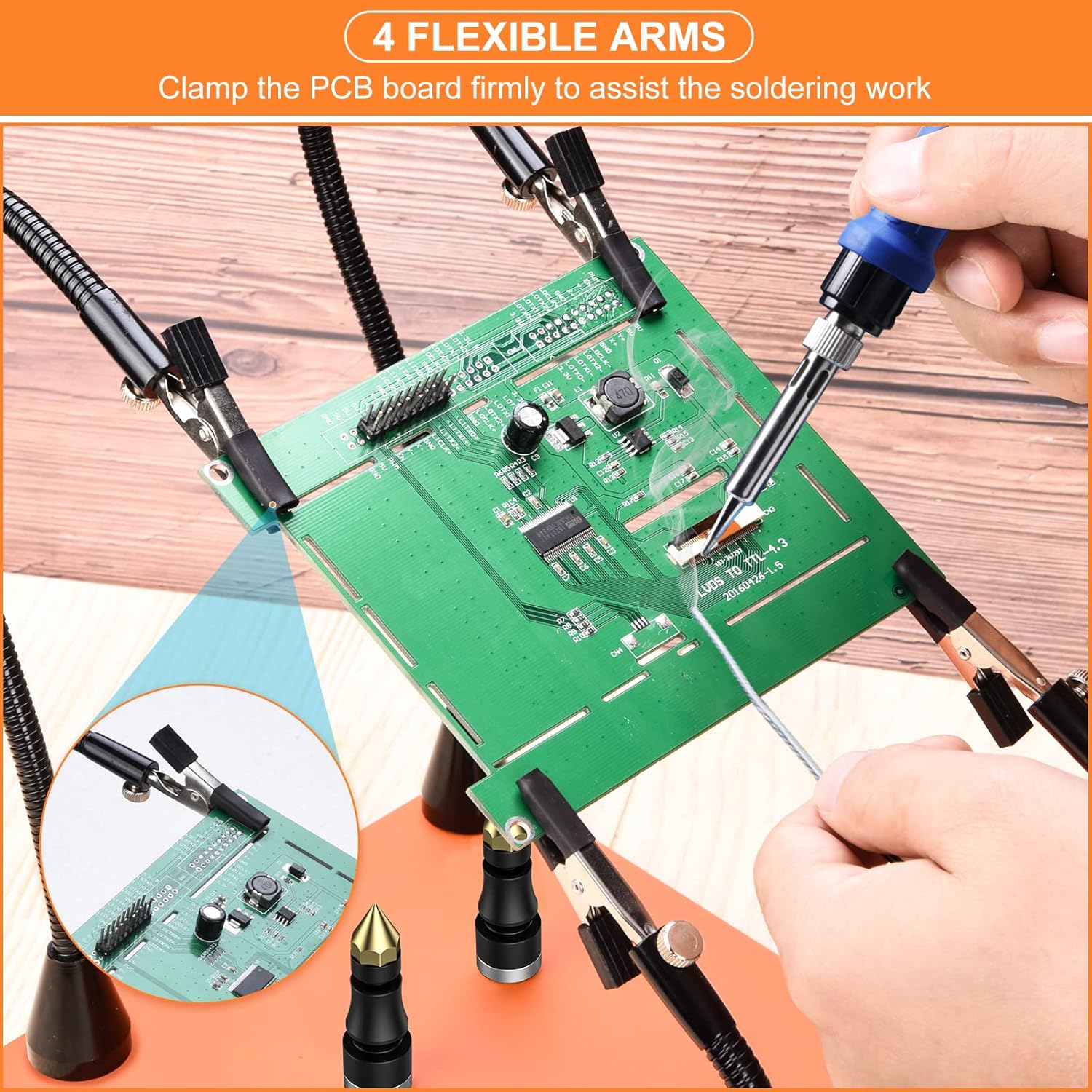 - Super magnetische dritte Hand: Unser drittes Lötwerkzeug enthält 4 verstellbare Metallhilfshände. So können Sie es bewegen in jede Richtung oder Position fixierte Leiterplatte oder Lötdraht. Erleichtert Ihre Arbeit als je zuvor.