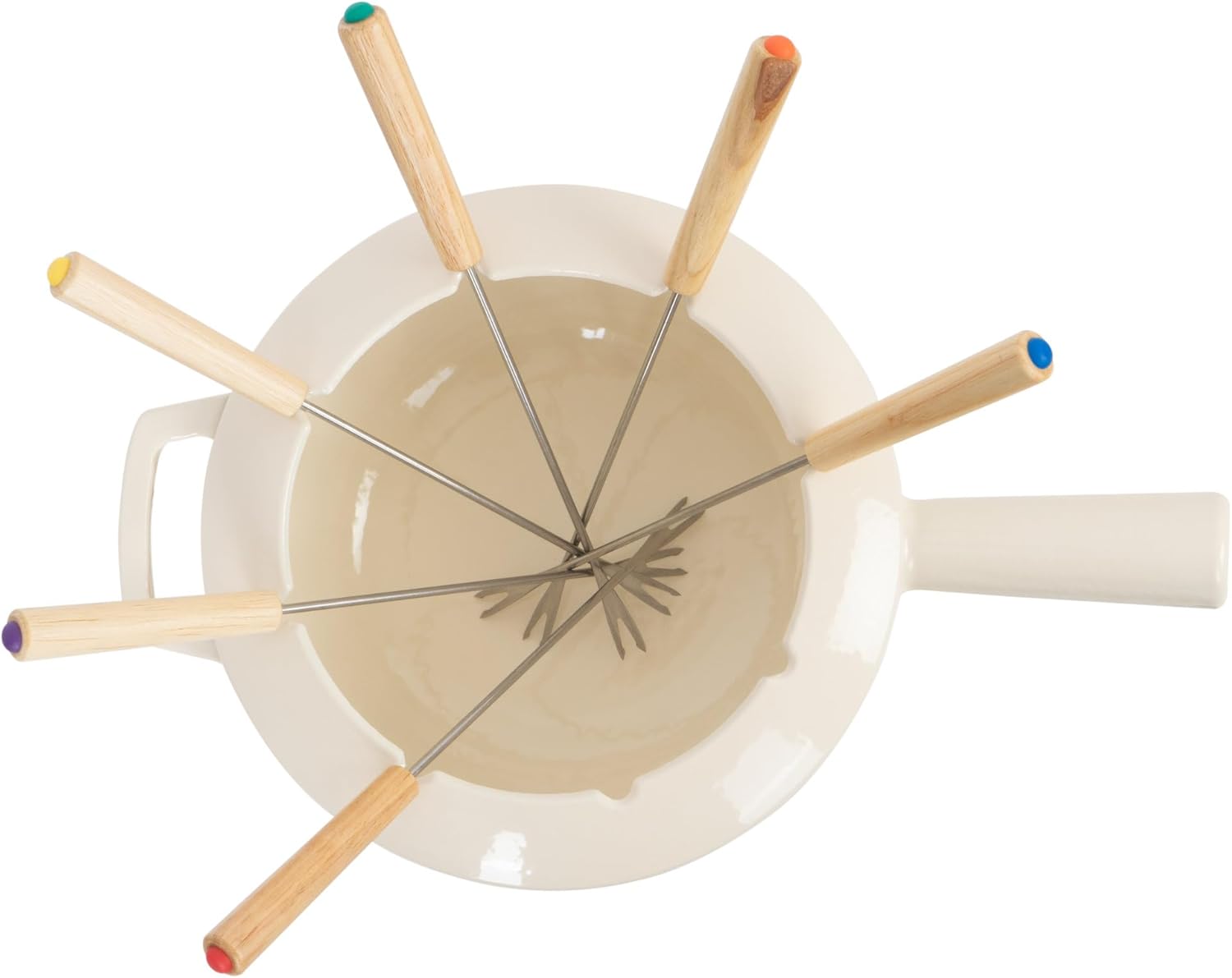 - FONDUEGABELN | Die im Lieferumfang enthaltenen sechs Fonduegabeln sind mit praktischen Holzgriffen ausgestattet, welche einen guten und sicheren Halt ermöglichen. Zusätzlich sind die Gabeln mit unterschiedlich farbigen Markierungen versehen, diese