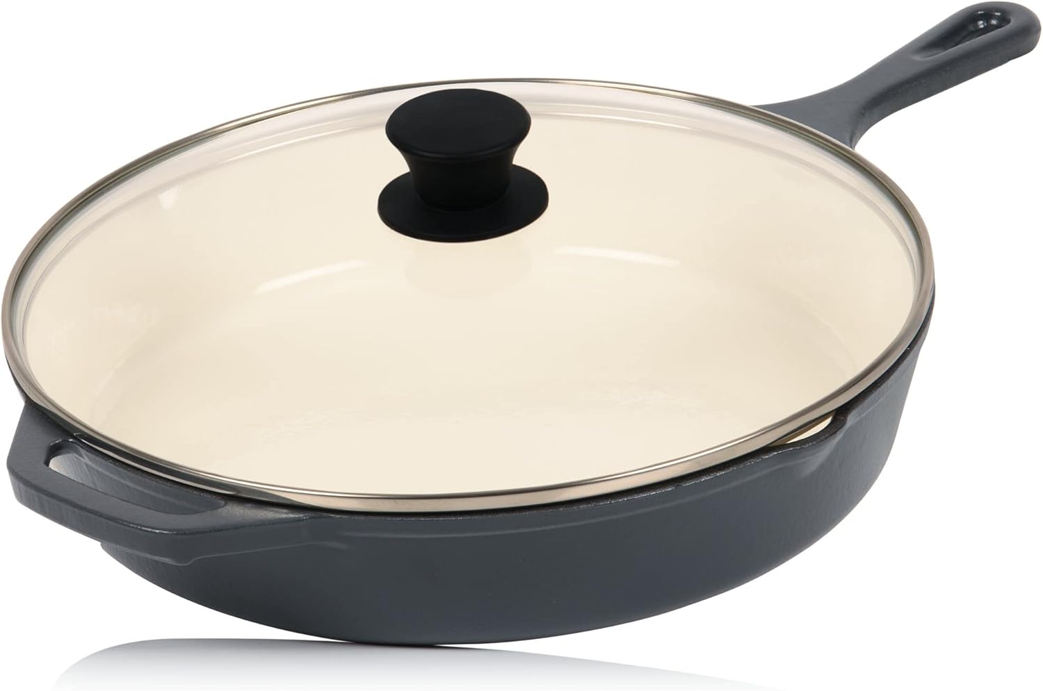 - GEEIGNET FÜR | Die Eisenguss Bratpfanne passt zu nahezu allen Gas-, Elektro-, Induktionsherden und anderen Kochstellen. Mit der Grillpfanne mit Deckel kann man überall kochen, braten und schmoren. So gelingt jedes Gericht im Handumdrehen.