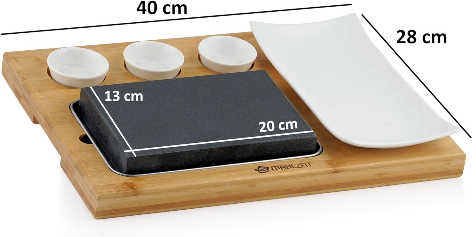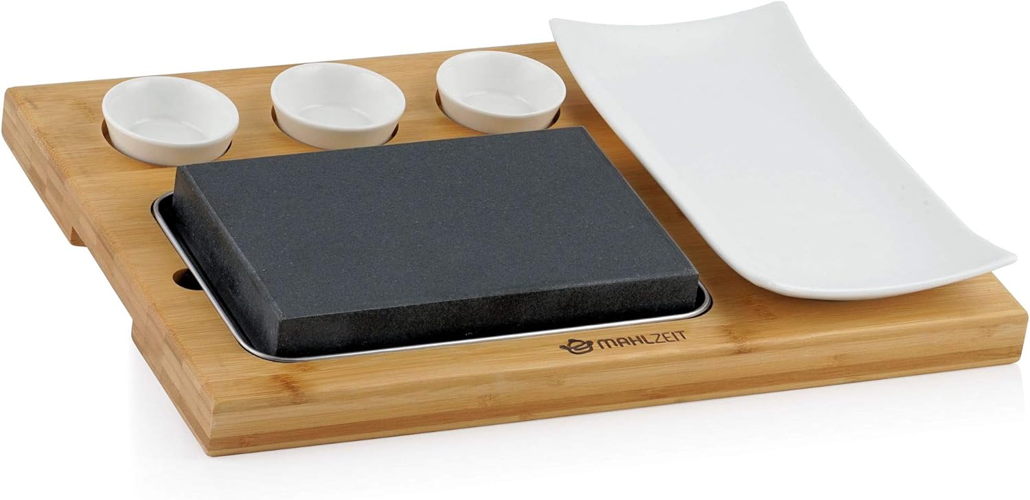 Mahlzeit Lavastein Set | Set mit heissem Stein, Teller und praktischem Bambus Holzbrett | Steak Stei