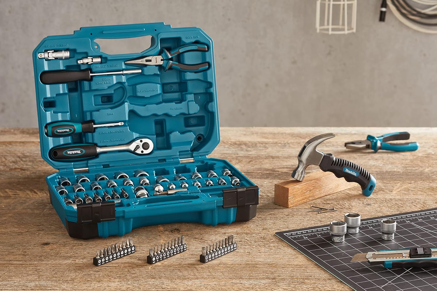 - 95 mm (3/8 Zoll) Ratschengriff, Abbrechmesser, Hammer, Kombizange.