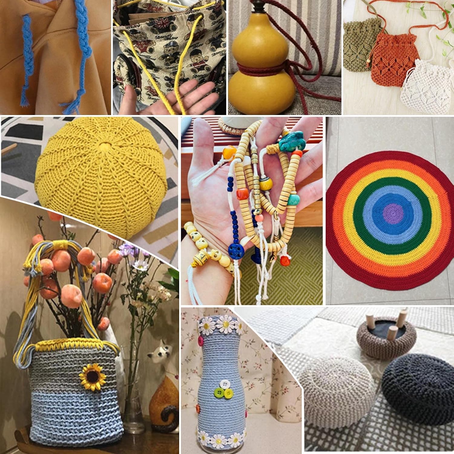 - Mehrzweck: Kann zum Stricken, Häkeln, Weben, Herstellen von Pflanzenaufhängern, Wandbehängen, Traumfängern, Untersetzern, Schlüsselanhängern, Obsttüten verwendet werden, kann auch zum Bündeln, Verpacken, Kordelzug für Geschenktüten, Gartengarn