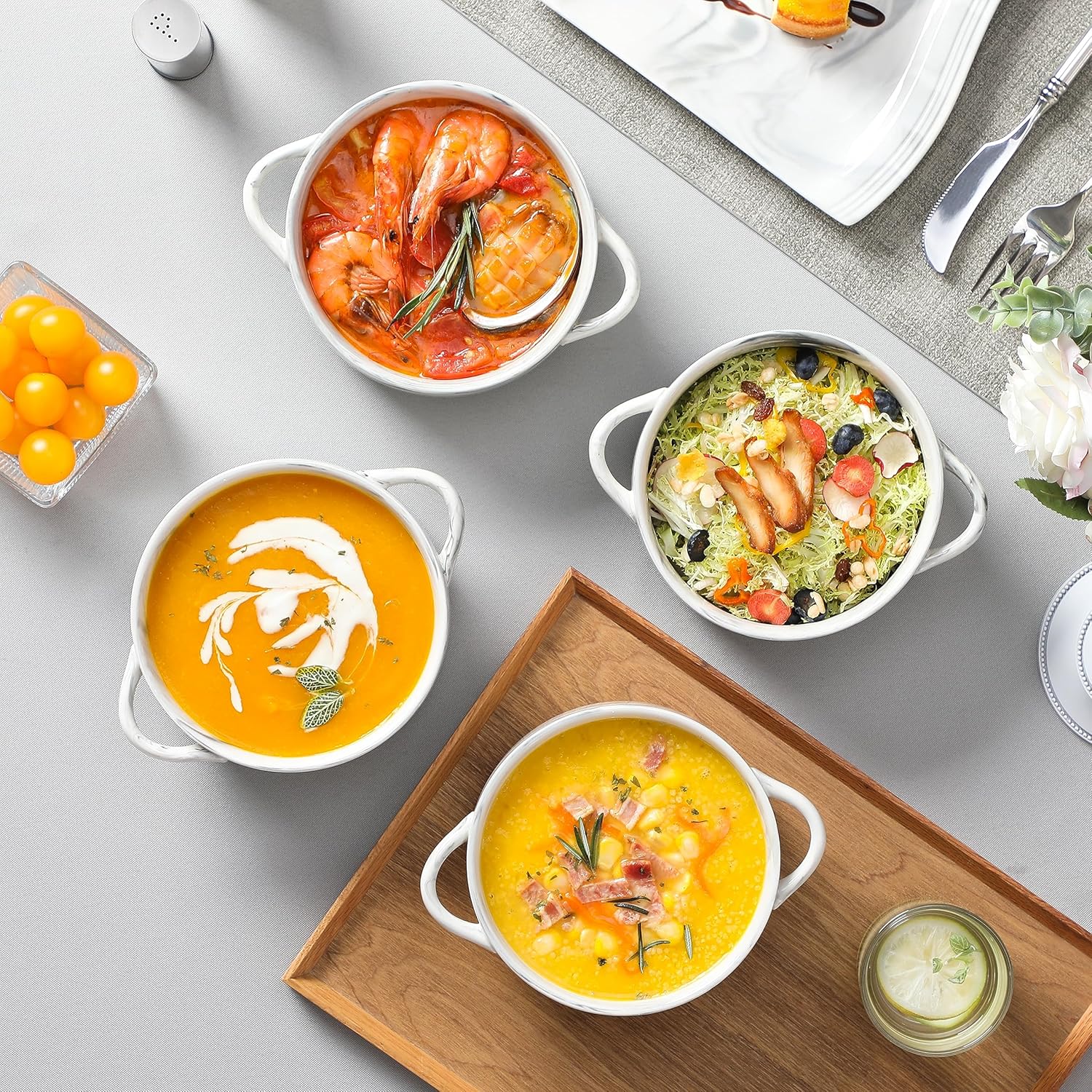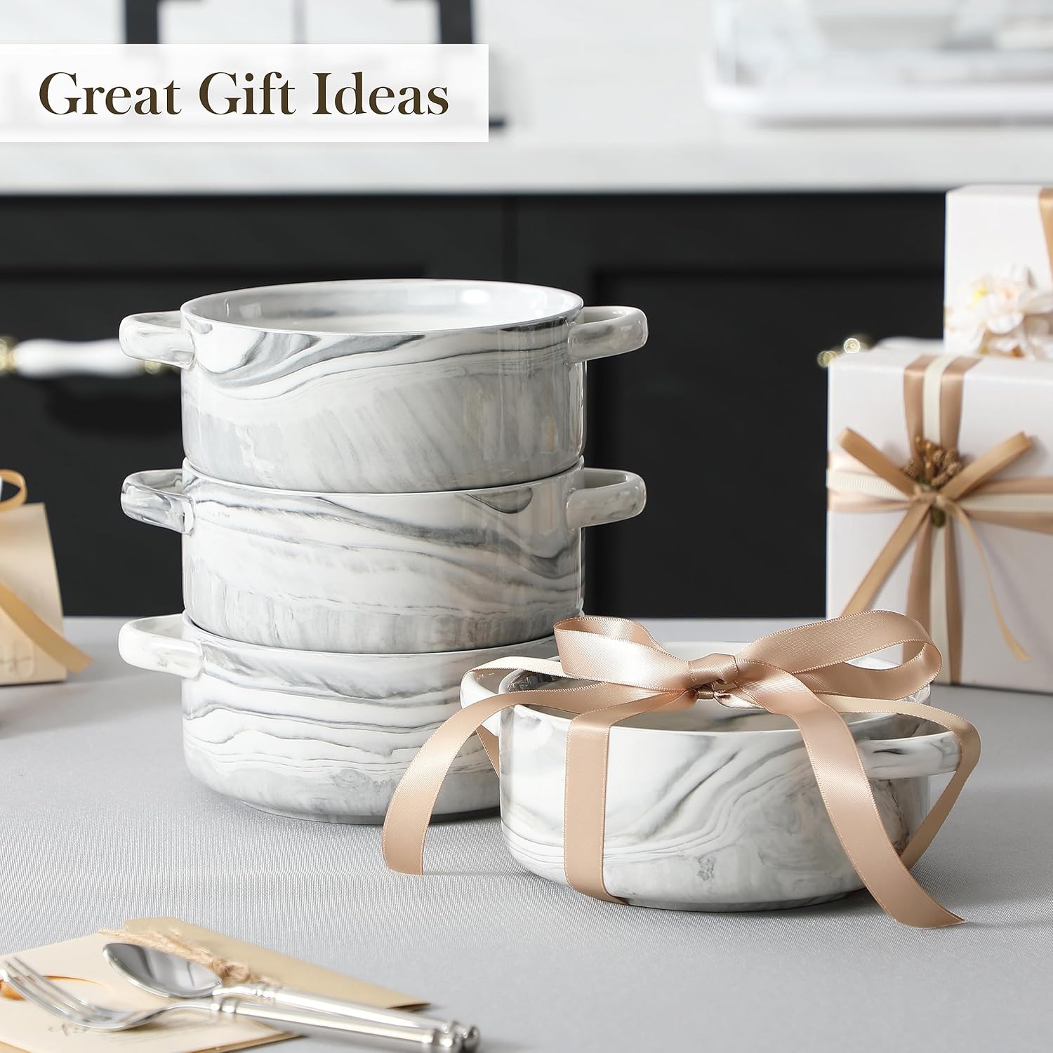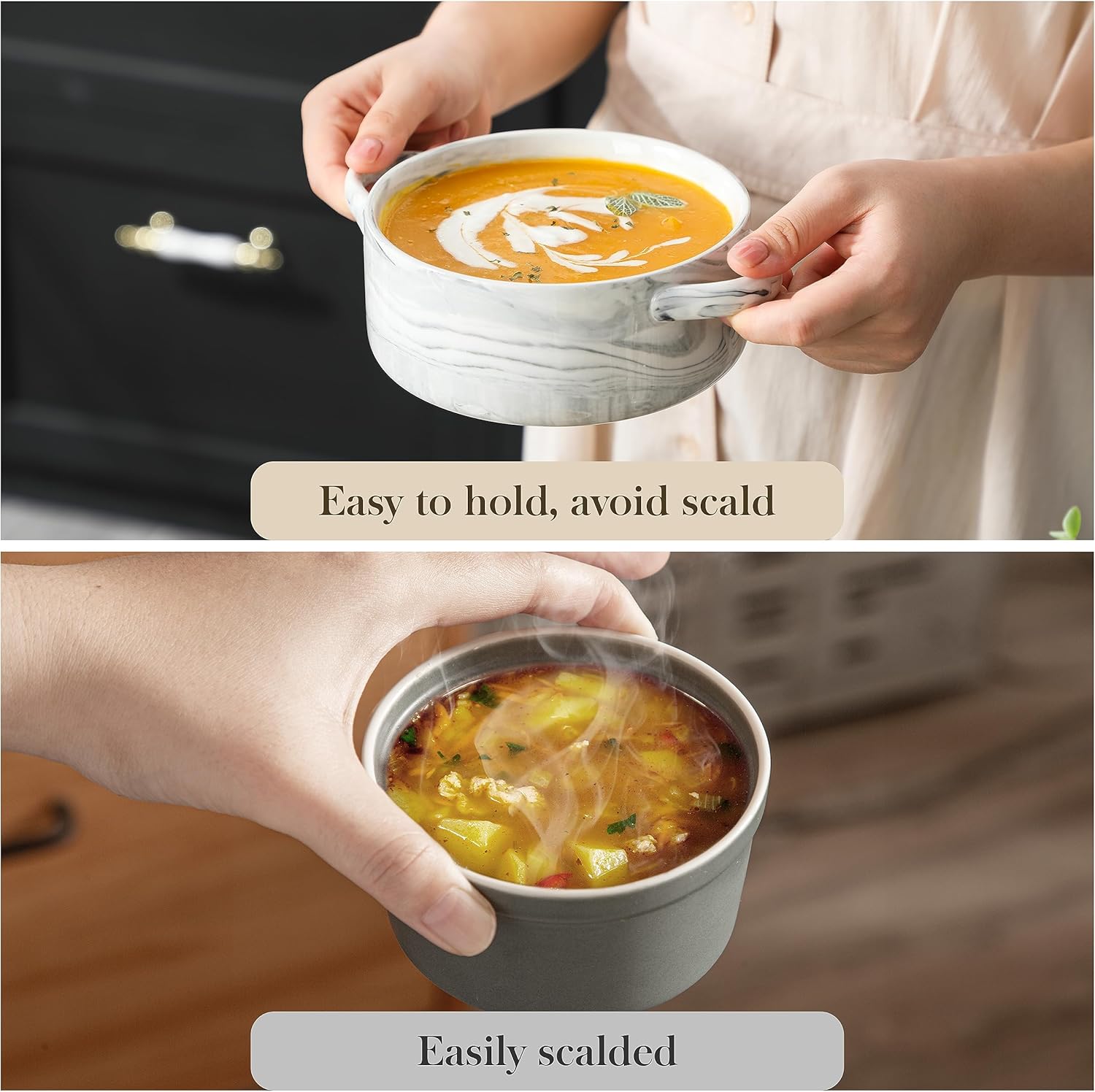 - Optimale Grösse – Jede Suppenschale fasst 800 ml und misst 19,8 cm mit Griffen sowie 6,5 cm in der Höhe. Perfekt für französische Zwiebelsuppe, Eintöpfe, Nudelsuppen, Müsli, Chili oder Desserts.