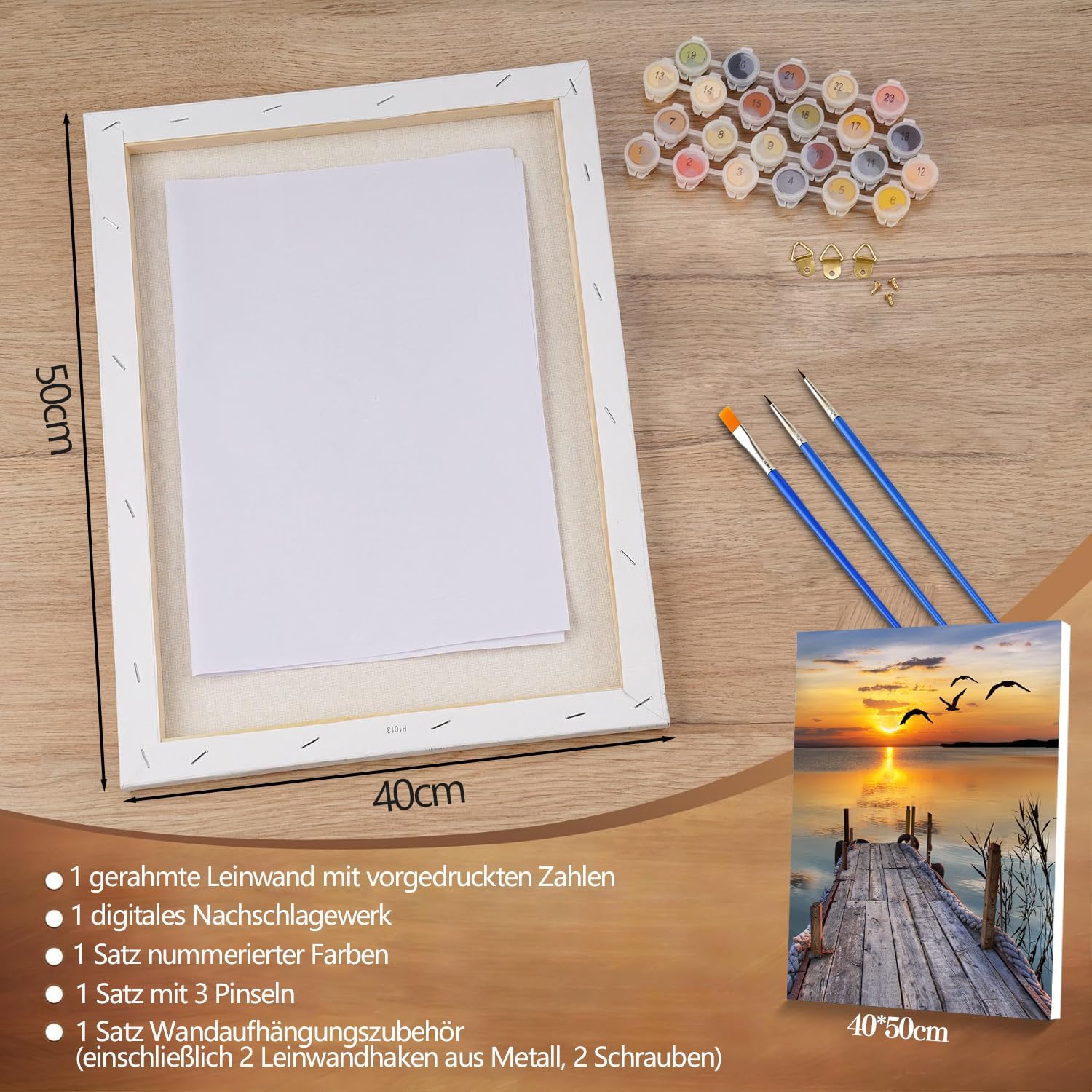 • Malen Nach Zahlen Kit:Alles enthalten: 3 spezielle Naturhaarpinsel (für Details wie Wolken/Wasser), Acrylfarbtöne und präzise Farbcodierung für authentische Tiefenwirkung.