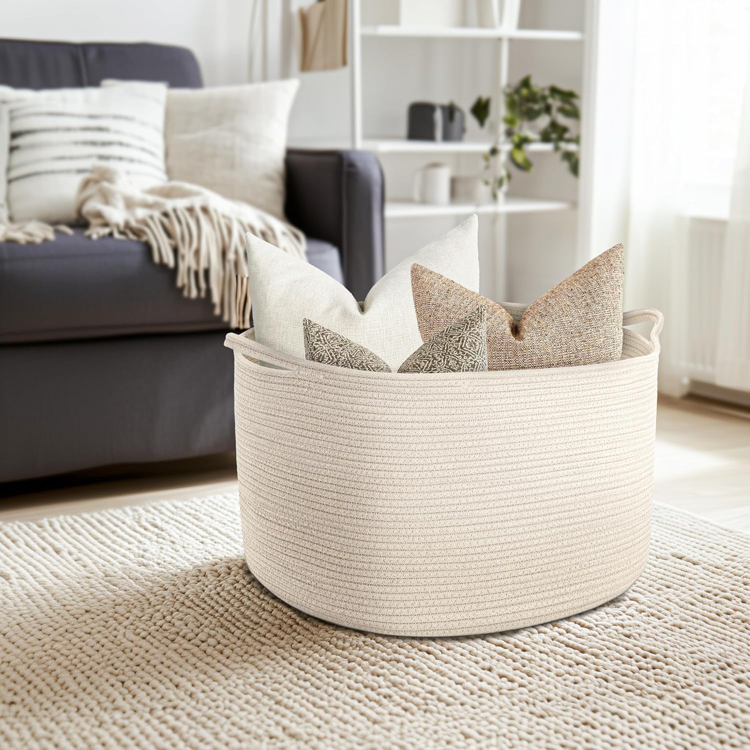 - Dekorativer Mehrzweckkorb: Der gewebte Korb in neutraler Farbe kann perfekt in jede Ecke Ihres Hauses integriert werden. Er kann als Decken-Aufbewahrungskorb für Wohnzimmer, Wäschekorb für Waschküche, Spielzeugkorb für Kinderzimmer, Kissenkorb für