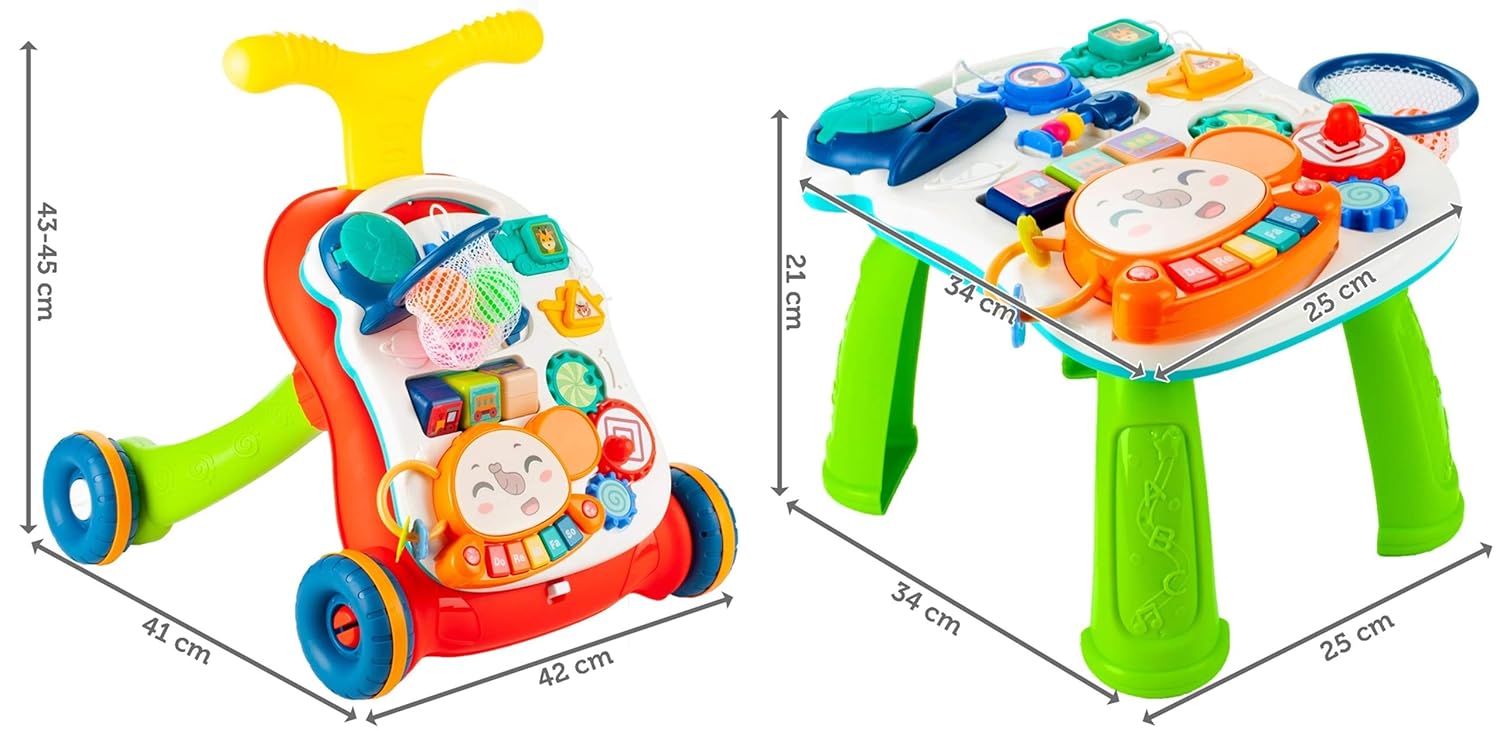 - 5-in-1: Das von uns vorgestellte Produkt kombiniert die Funktionen einer Gehhilfe, eines Lerntisches, einer Spielzeugtafel, eines Basketballspiels und eines Klaviers.