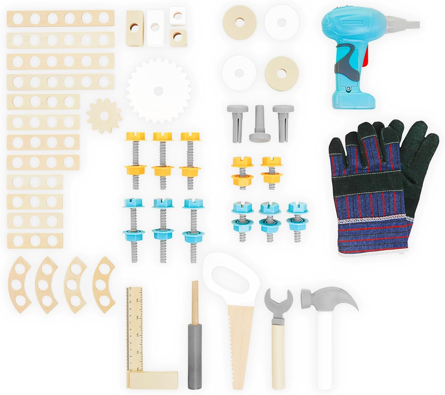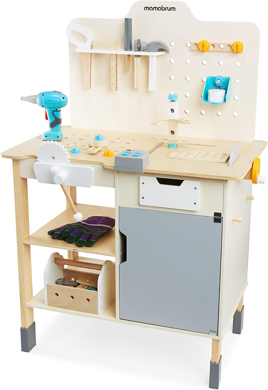 - Die Grösse der Werkzeuge ist an kleine Hände angepasst, sie sind leicht und angenehm zu bedienen. Ein beweglicher Schraubstock, eine Kreissäge, ein Soundpanel und ein Akkuschrauber eröffnen die Tür zu grenzenlosem, kreativem Spass. Das Basteln