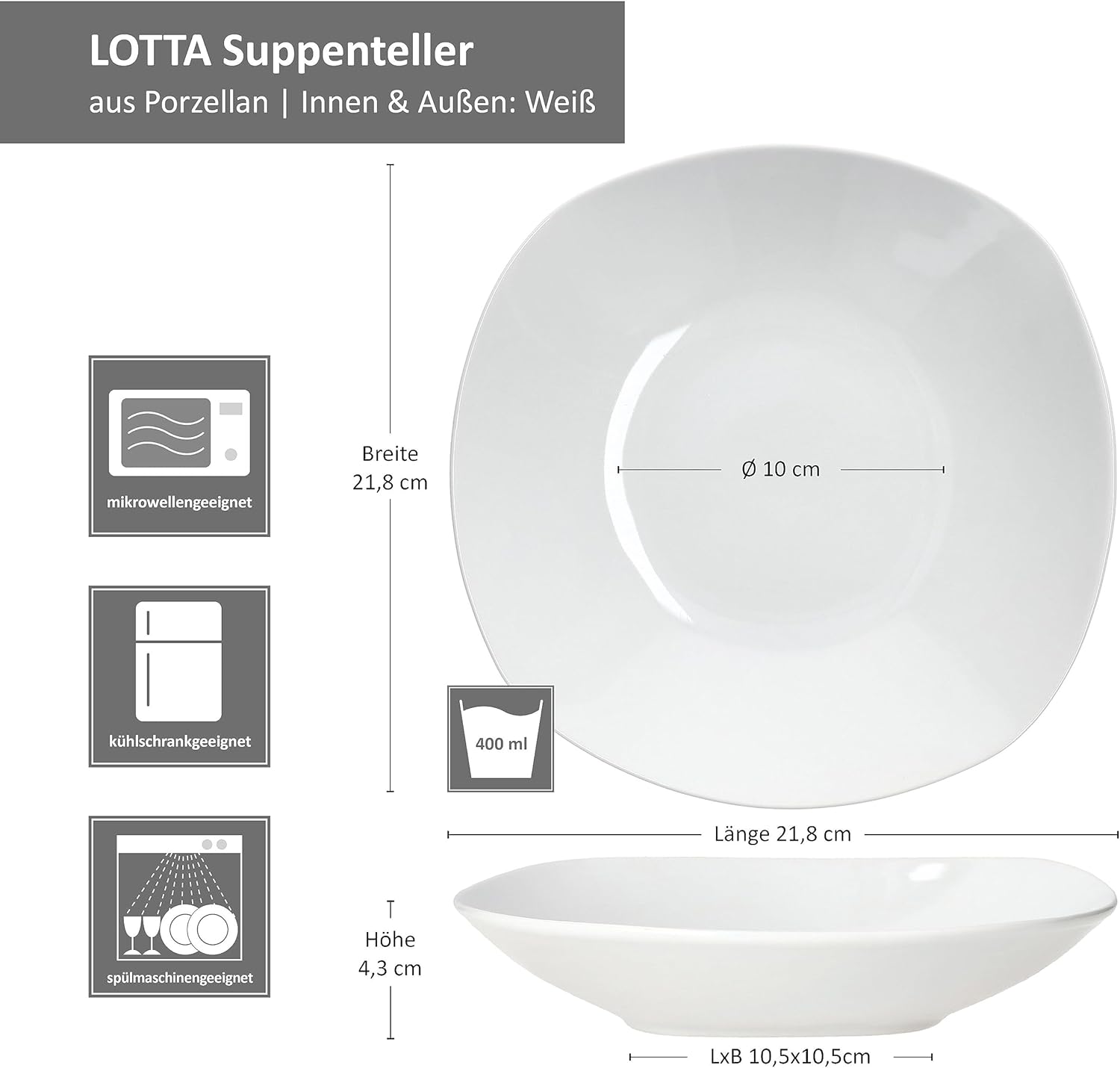 - Dekor: innen und aussen Weiss | beidseitig glänzend vollglasiert | Die aussergewöhnliche Gestaltung durch die abgerundete quadratische Form erzeugt einen modernen Look
