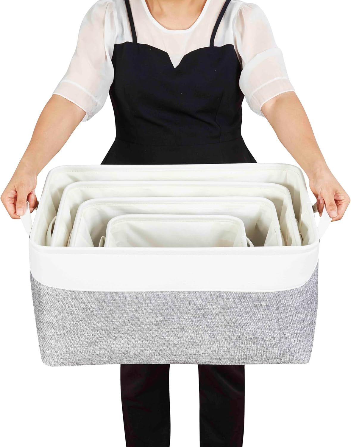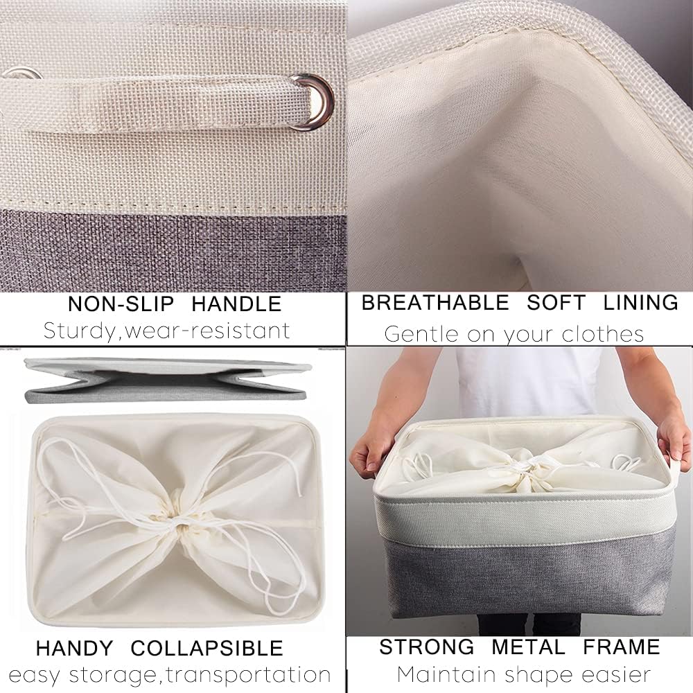 - Masse: gross Aufbewahrungskörbe von 17.3 (L) x 12.2 (W) x 9 (H) Zoll (44 x 31 x 23 cm), rechteckige Aufbewahrungsbox. Material: Leinen, Baumwolle, EVA, Polyester. Farbe: Weiss / Grau