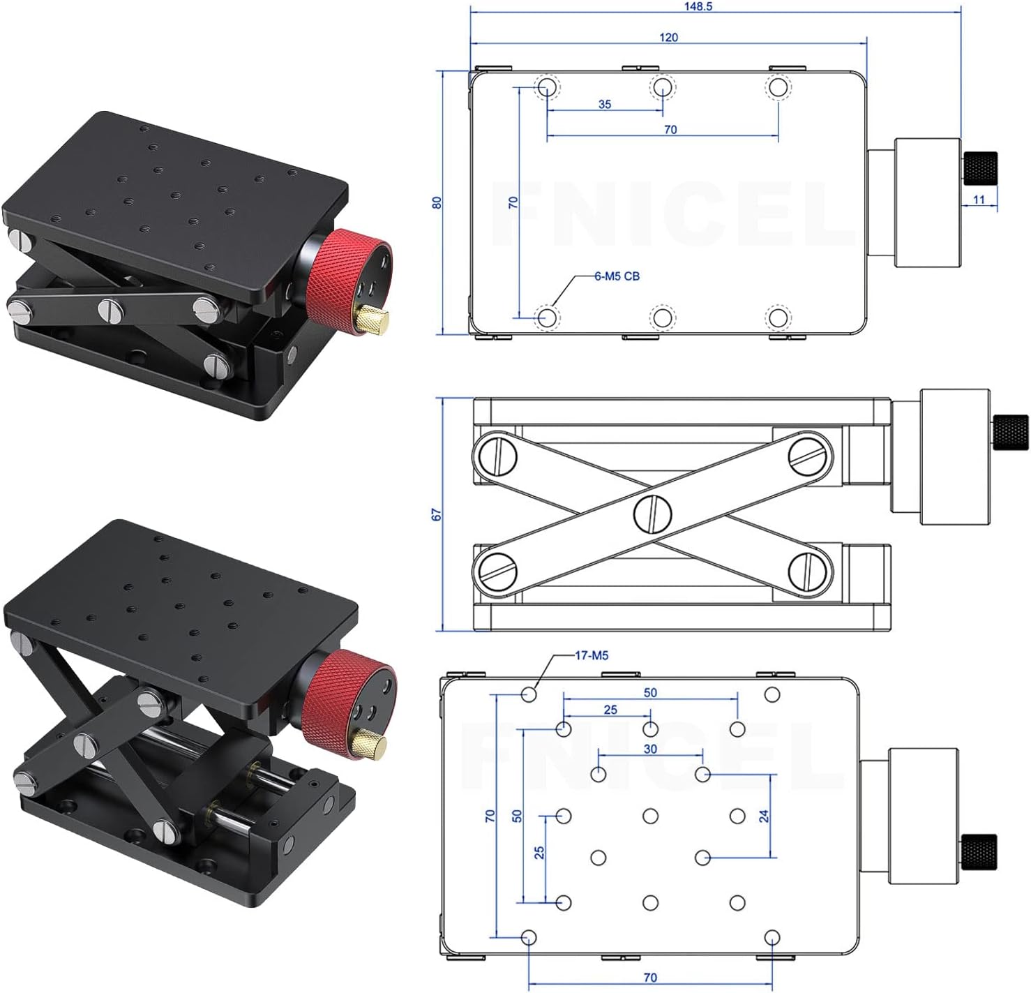 - Einfach zu installieren: Die oberen und unteren Seiten sind mit einer porösen Position entworfen, die als Montagefläche für starke Anwendbarkeit verwendet werden kann. Die Basis und der Tisch haben Standard-Lochabstandslöcher (Gewindelöcher M5) für
