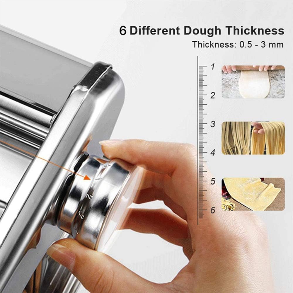 • 💕[Einstellbare Einstellungen]: Die Nudelmaschine hat 6 einstellbare Zahnräder, mit denen Sie die Dicke des Teigs einstellen und leicht feine Nudeln herstellen können, die Ihnen verschiedene Aromen und Texturen bieten.
