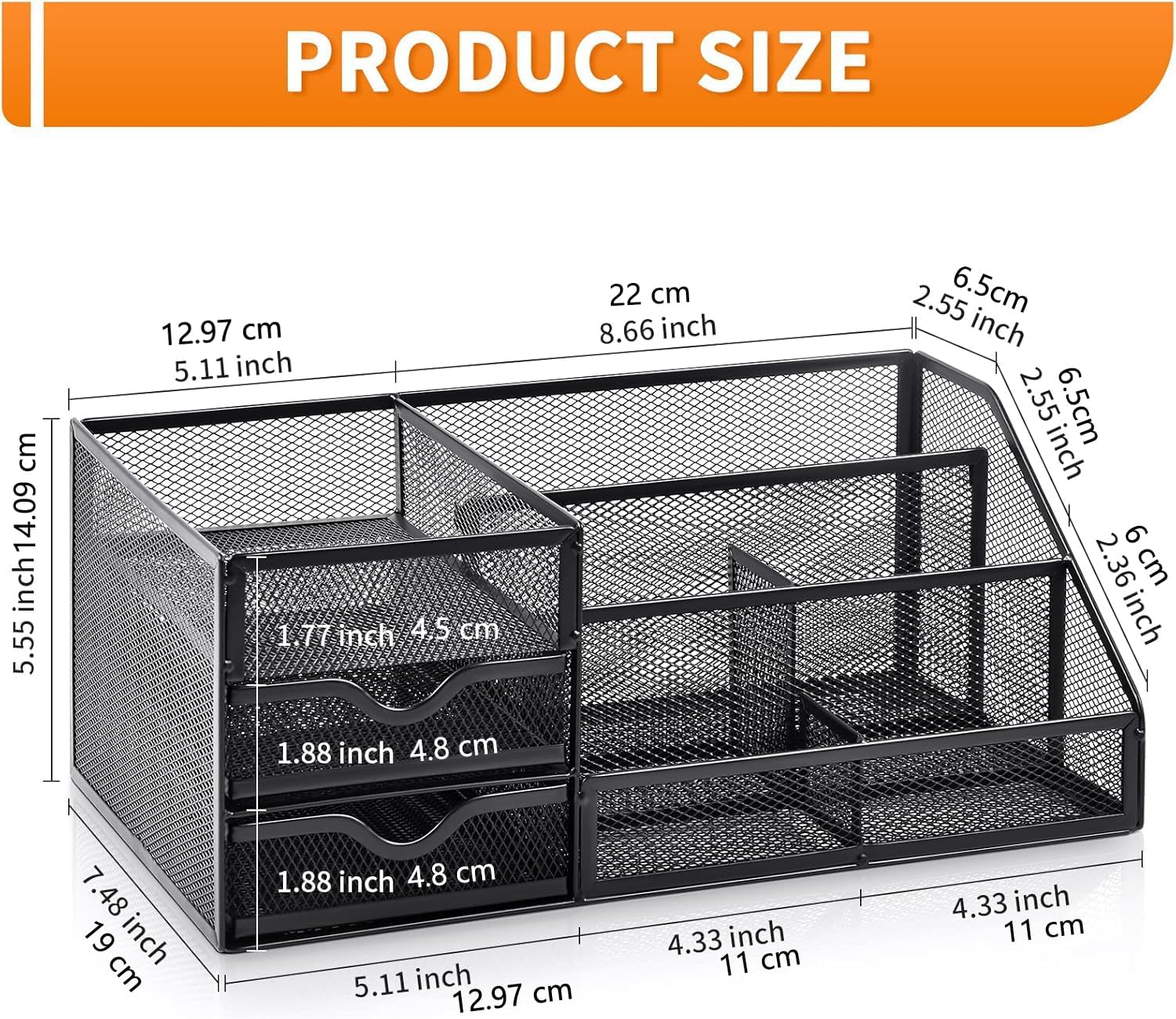 - (GRÖSSERER KAPAZITÄTS-ORGANIZER) Angesichts der Forderung vieler Kunden nach grösserem Speicherplatz geben wir den neuen Desktop-Organizer heraus, um Unordnung zu vermeiden. Die Abmessungen des Mesh-Schreibtisch-Organizers betragen 13,77 x 7,48 x 5,55